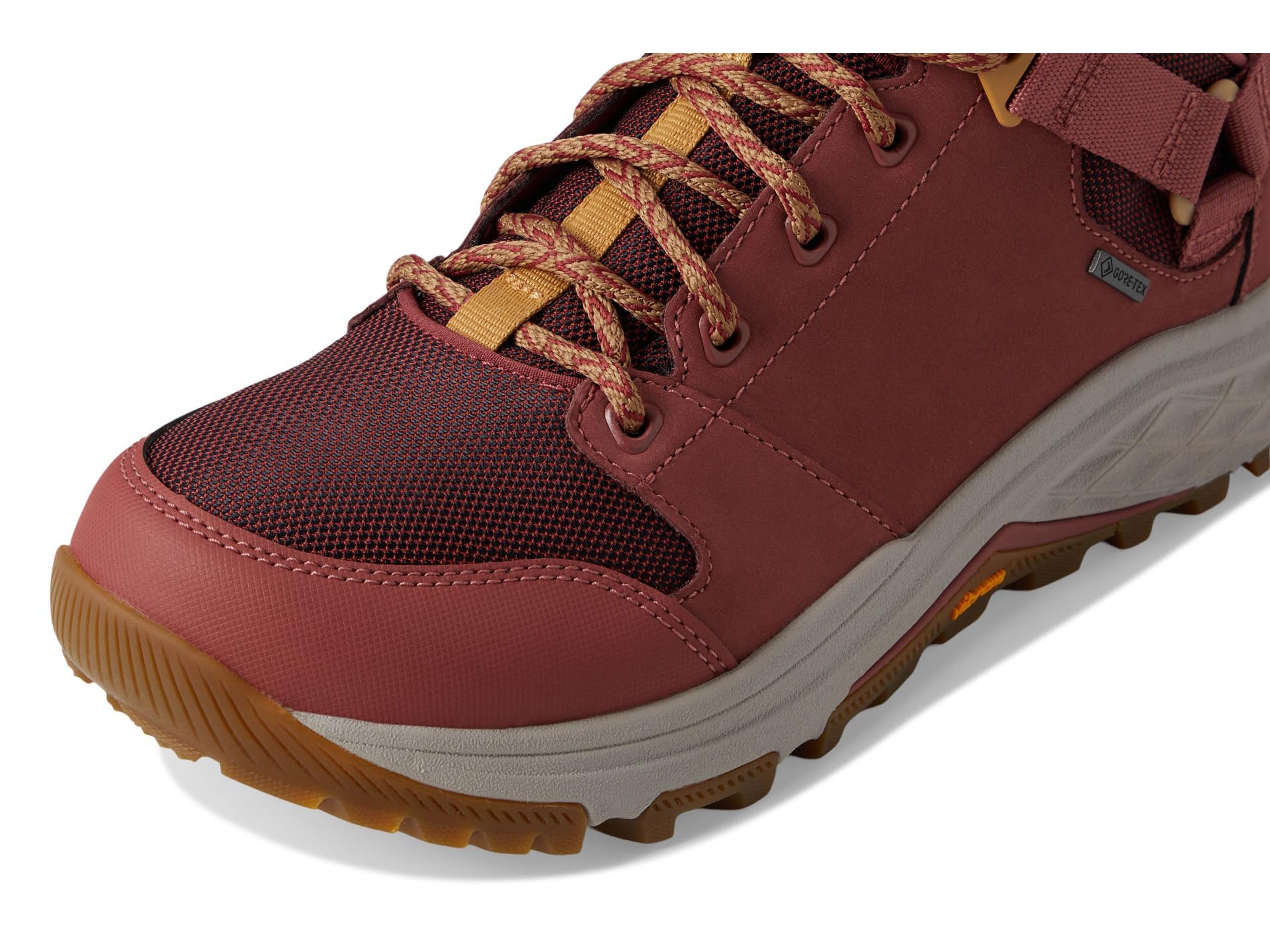 Description Tackling day hikes and weeklong excursions with the same rugged dependability, the Grandview GTX combines waterproof leather and quick-dry mesh with a GORE-TEX bootie to seal out the elements. A wider toe-box frees toes while an adjustable Universal Heel Lock System keeps your foot in place for minimal toe pressure during downhill treks. The Vibramβ’ Megagrip outsole provides traction and stability for wherever the trail takes you.