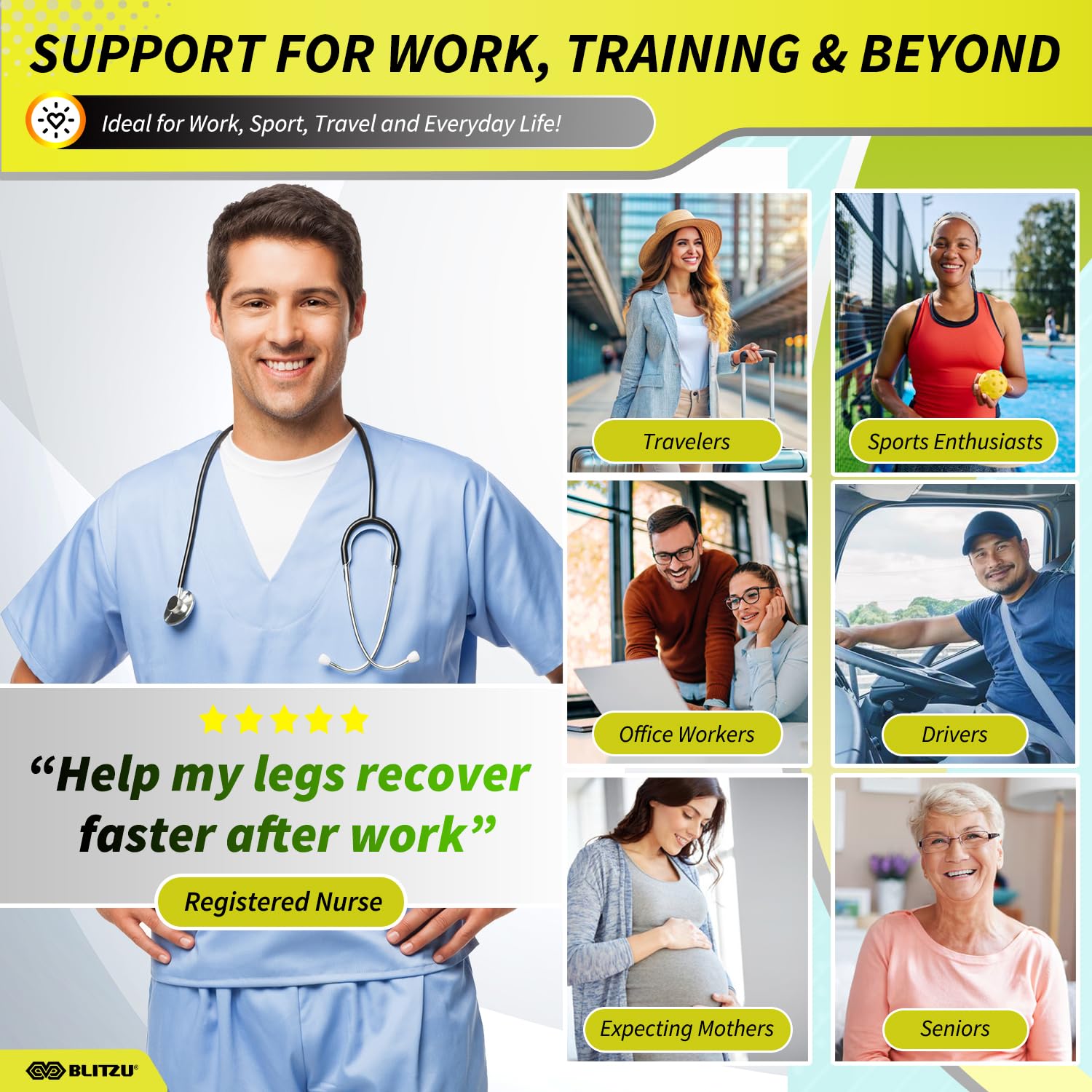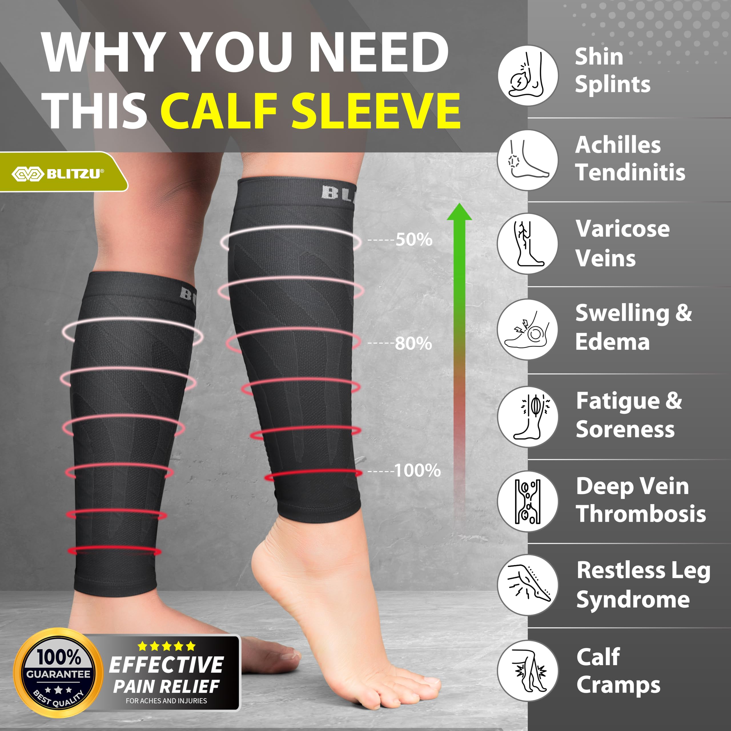 Effective Graduated Compression for Swelling & Varicose Veins Relief: BLITZU Leg Compression Sleeve delivers targeted compression to enhance blood flow, reduce leg swelling, and relieve pain from varicose veins and pregnancy-related edema. Ideal for nursing mothers, individuals with poor circulation, and anyone seeking compression therapy for relief from leg pain and swelling.