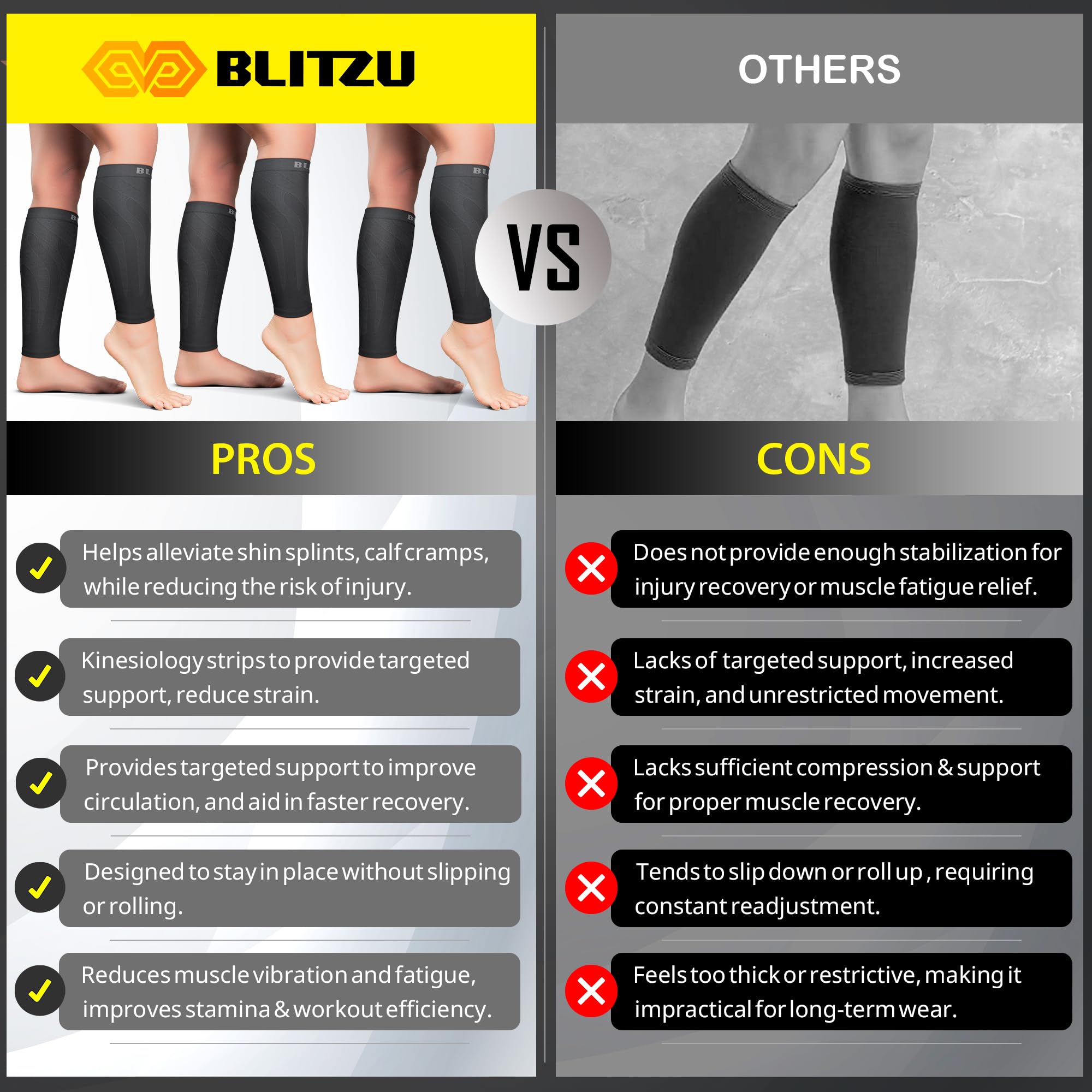 Patented Kinesiology Strips for Targeted Pain Relief & Support: Engineered and patented in New York, BLITZU Calf Compression Sleeves feature advanced kinesiology strips that provide enhanced support, stability, and effective pain relief. Utilizing proven kinesiology taping techniques, these compression sleeves improve muscle function, reduce fatigue, and accelerate recovery making them ideal for athletes, runners, and anyone seeking superior leg support and injury prevention.