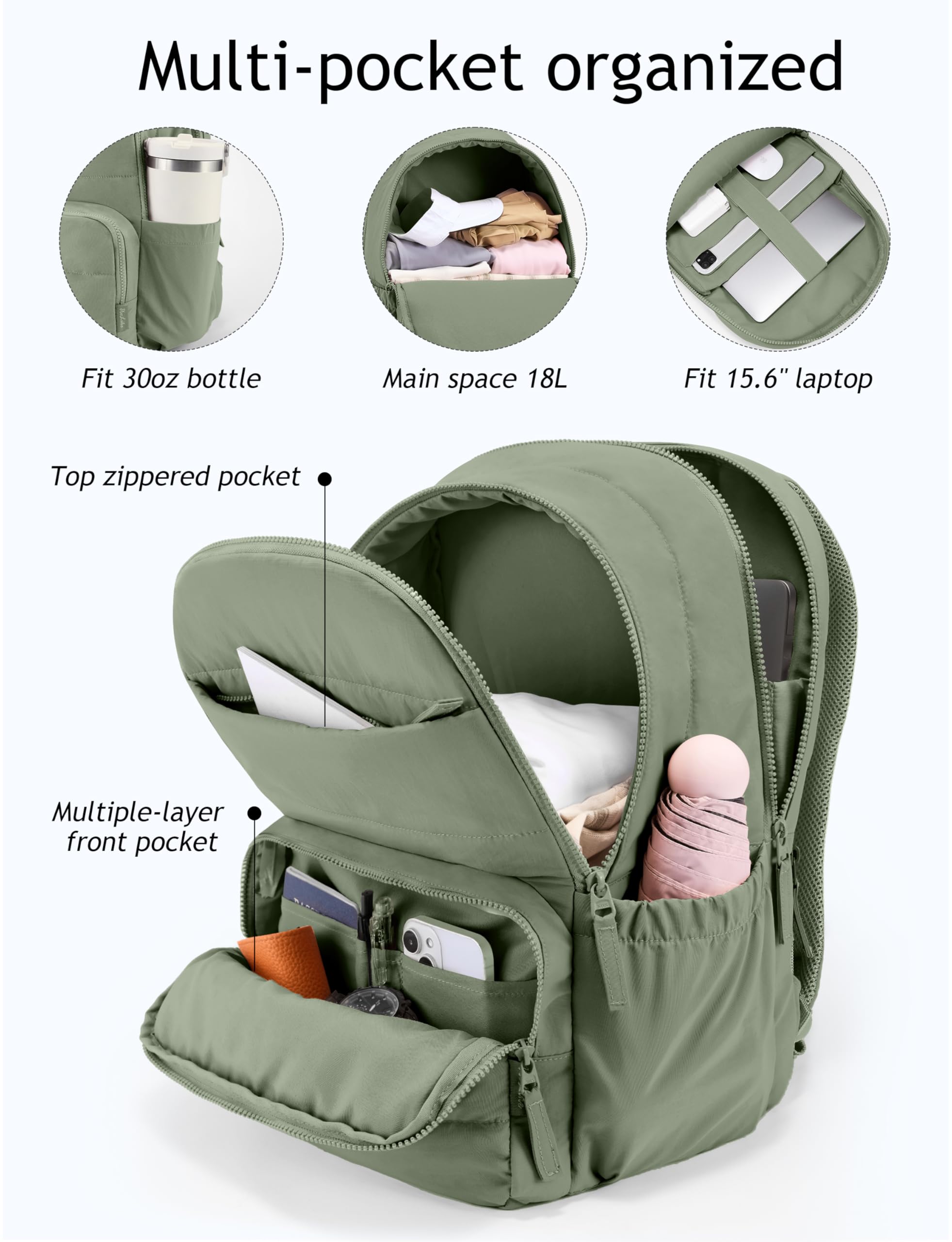 LARGE CAPACITY & DOUBLE ZIPPER: The separate laptop compartment fits up to a 15.6'' laptop, easy to access. Large 18L capacity main space is roomy enough for your college or work essentials such as books, A4 folders, and even clothes for a short trip of 1-2 days. Both have double zippers so you can zip from either side. Dimensions: 16.5×11.4×8.4 inches.