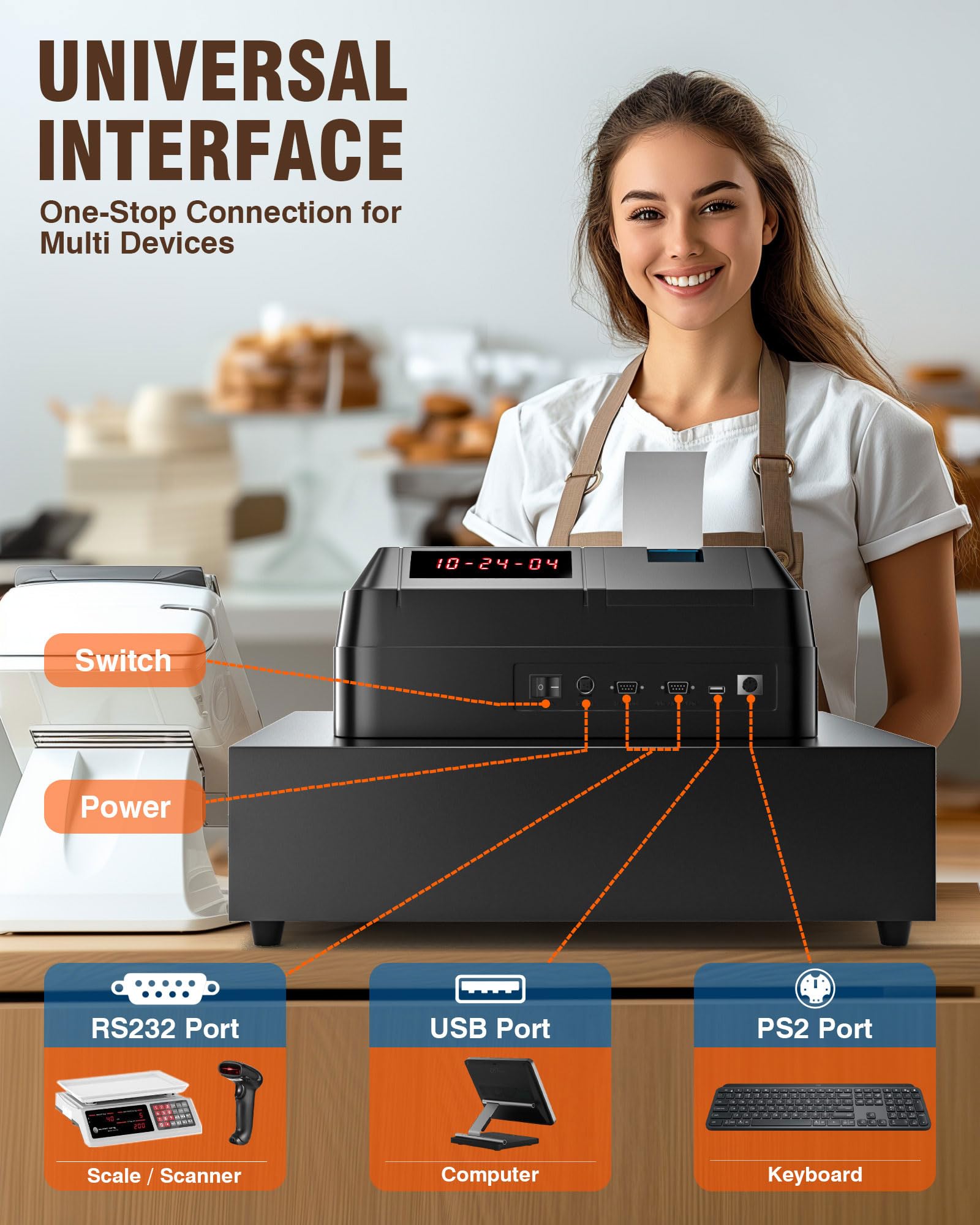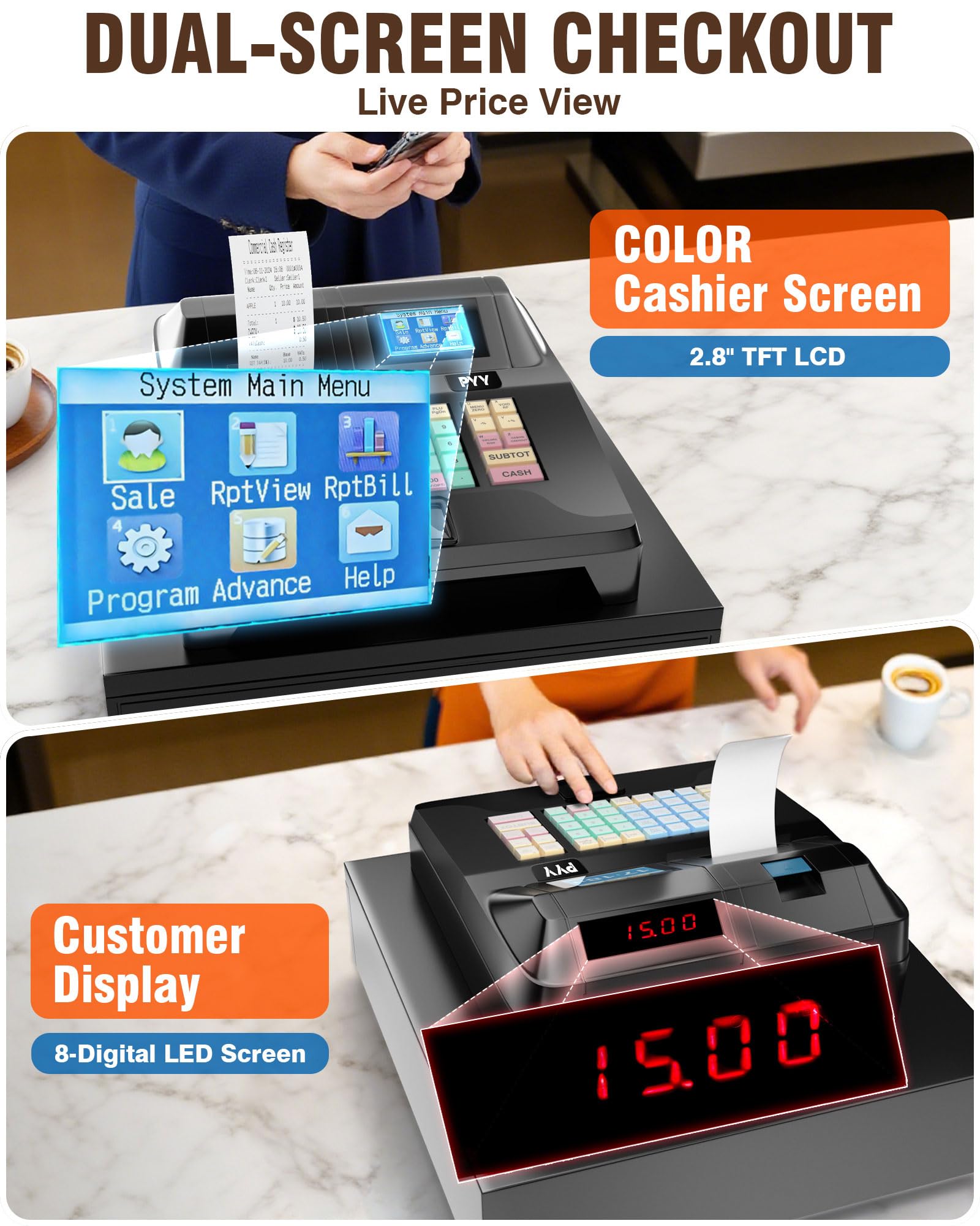 MULTIFUNCTIONAL ALL-IN-ONE DESIGN The PYY cash register integrates a receipt printer, dual screens, and a cash drawer, saving you time and cost. The built-in thermal printer has a print speed of up to 90mm/s, reducing customer wait times. It features a 2.8-inch TFT LCD for the cashier and an 8-digit LED display for customers. The integrated cash drawer pops open during transactions.