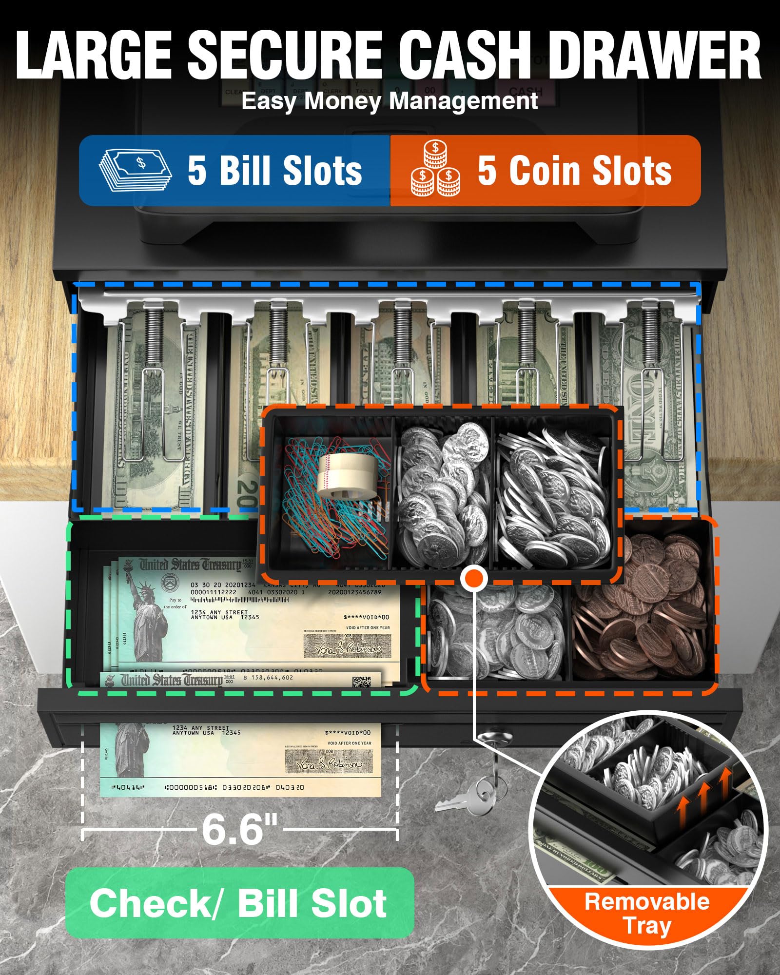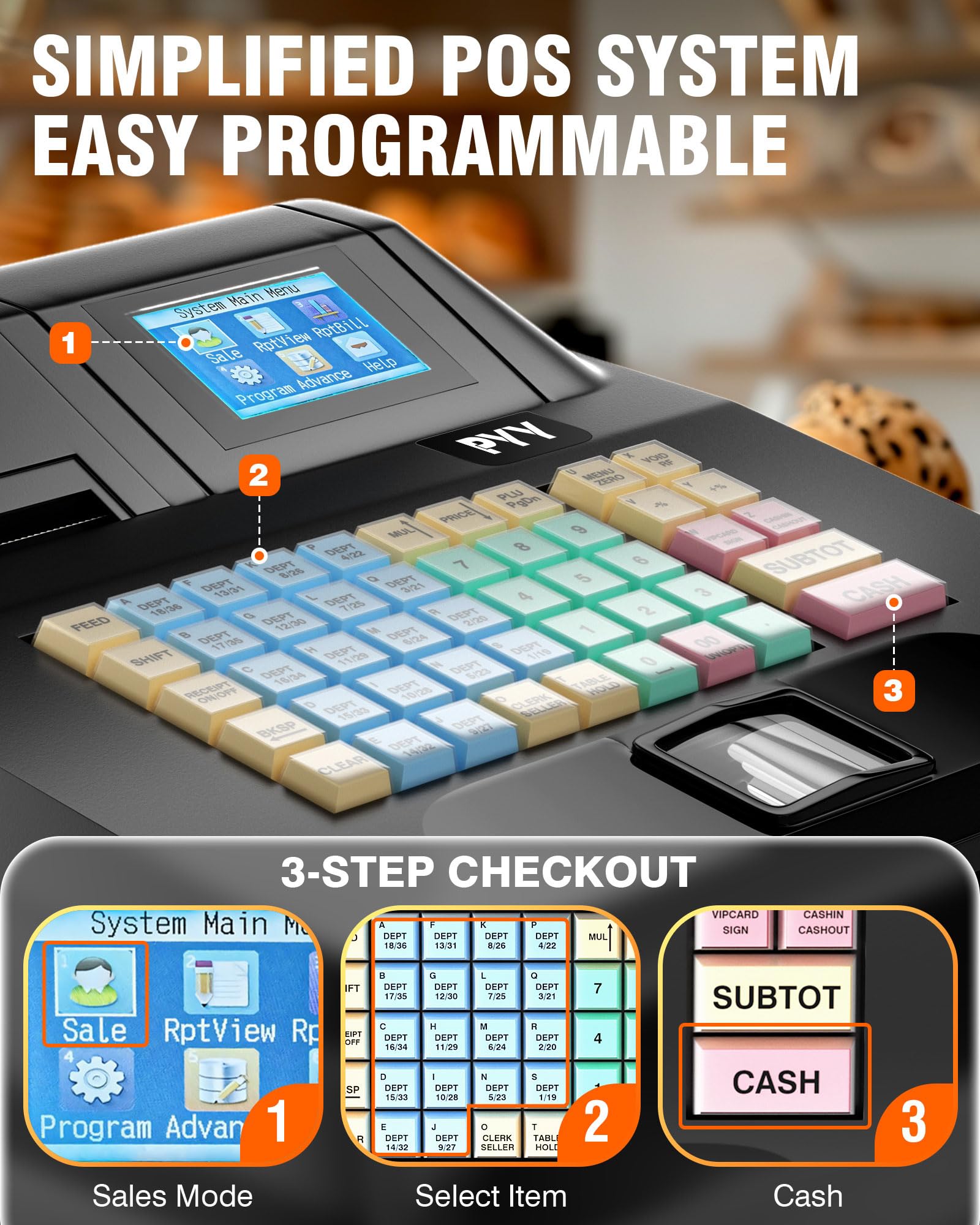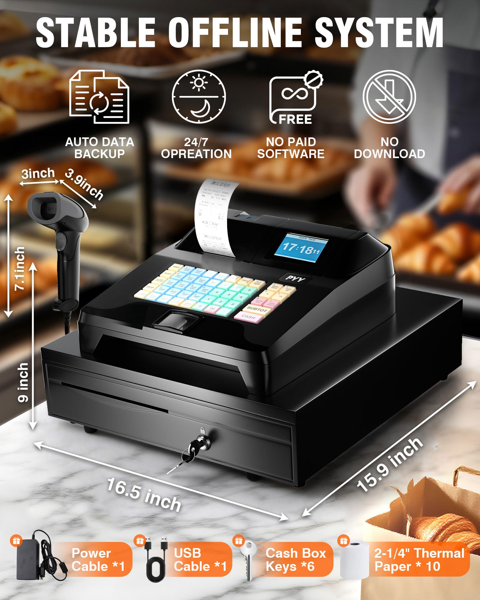 WORRY-FREE SERVICE The PYY cash register has passed both RoHS and FCC certifications. Package includes the cash register, 10 rolls of 2 1/4" thermal paper, USB cable, power cord, 6 cash drawer keys and user manual. Ideal for small supermarkets, convenience stores, and restaurants. We offer a one-year coverage and professional one-on-one technical support. Please reach out to us if you encounter any issues.