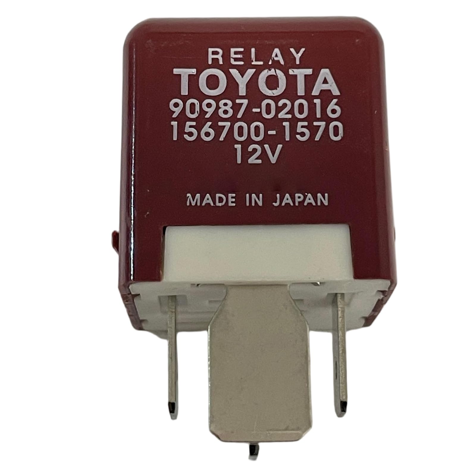90987-02016 4-Pin Automotive Relay (12V) Direct-fit replacement by part number for vehicles that specify 90987-02016 (superseded by 90080-87024; engineering ref 156700-1570). Match the OE number on your original relay and the cavity in the under-hood fuse/relay box for guaranteed fit. Specifications Voltage: 12V DC Pins: 4 (standard automotive micro-ISO form for high-load circuits) Body Color: Brown (varies by production) OE Part Numbers: 90987-02016; Replaces 90080-87024; Denso ref 156700-1570 Function & Symptoms Used by different vehicles for headlamp or cooling-fan circuits (application depends on the model/trim). Typical symptoms of a failed relay: target component does not power on or is intermittent (e.g., no headlights or radiator fan inoperative) while fuses and wiring test OK. Installation Location Mounts in the engine room fuse/relay box (junction block). Refer to the relay layout chart on the fuse box cover or the service manual to locate the exact cavity. Vehicle Compatibility (match OE number & cavity) Compatible with Toyota (by year): Avalon 2000–2003; Camry 2002–2004; Celica 2000–2003; Corolla 2003–2005; Echo 2000–2003; Highlander 2003–2005; MR2 Spyder 2000–2003; Prius 2001–2003; RAV4 2001–2004; Sienna 2000–2003. Compatible with Lexus (by year): ES300 2002–2003; ES330 2004; LS430 2001–2004. Recommended Companion Parts (not included) Mini Fuse (OE 90982-09008) and Fusible Link (OE 90982-08202) in the same circuit, if heat-stressed or damaged. Engine room junction/relay block components as required by inspection. Notes This is a replacement part sold by reference to the OE number. Always verify the original part number and relay slot before ordering.