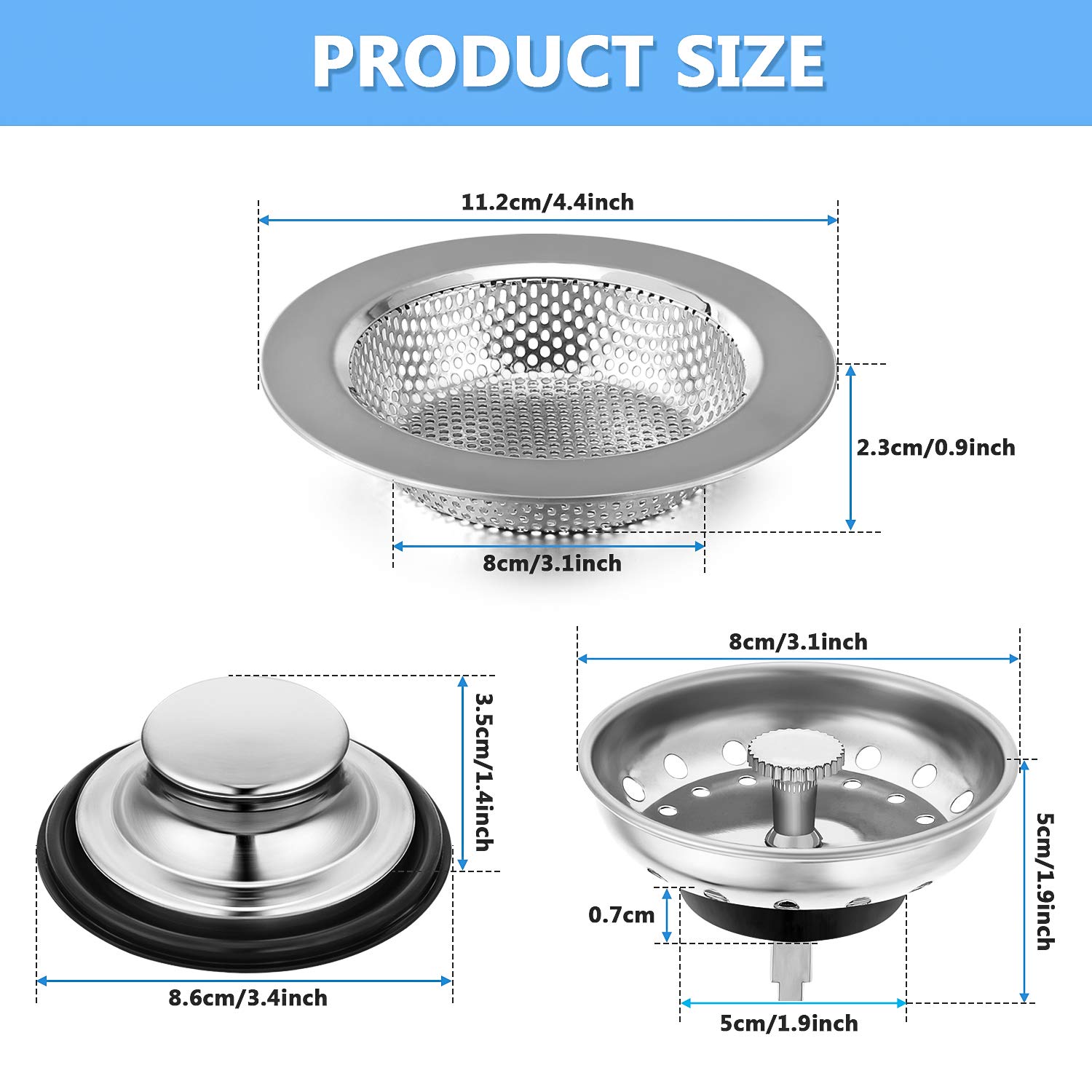 Universal Fit: the garbage disposal stopper and sink strain are in universal sizes, suitable for most 3-1/2 inch kitchen sink drains or old sink filters in United States; And the kitchen sink filter sieve is universal which fits most sink drains and garbage disposals; Note: the strainer fit the sink drains with a narrow rectangular hole in the center, please confirm your sink drain hole size before order