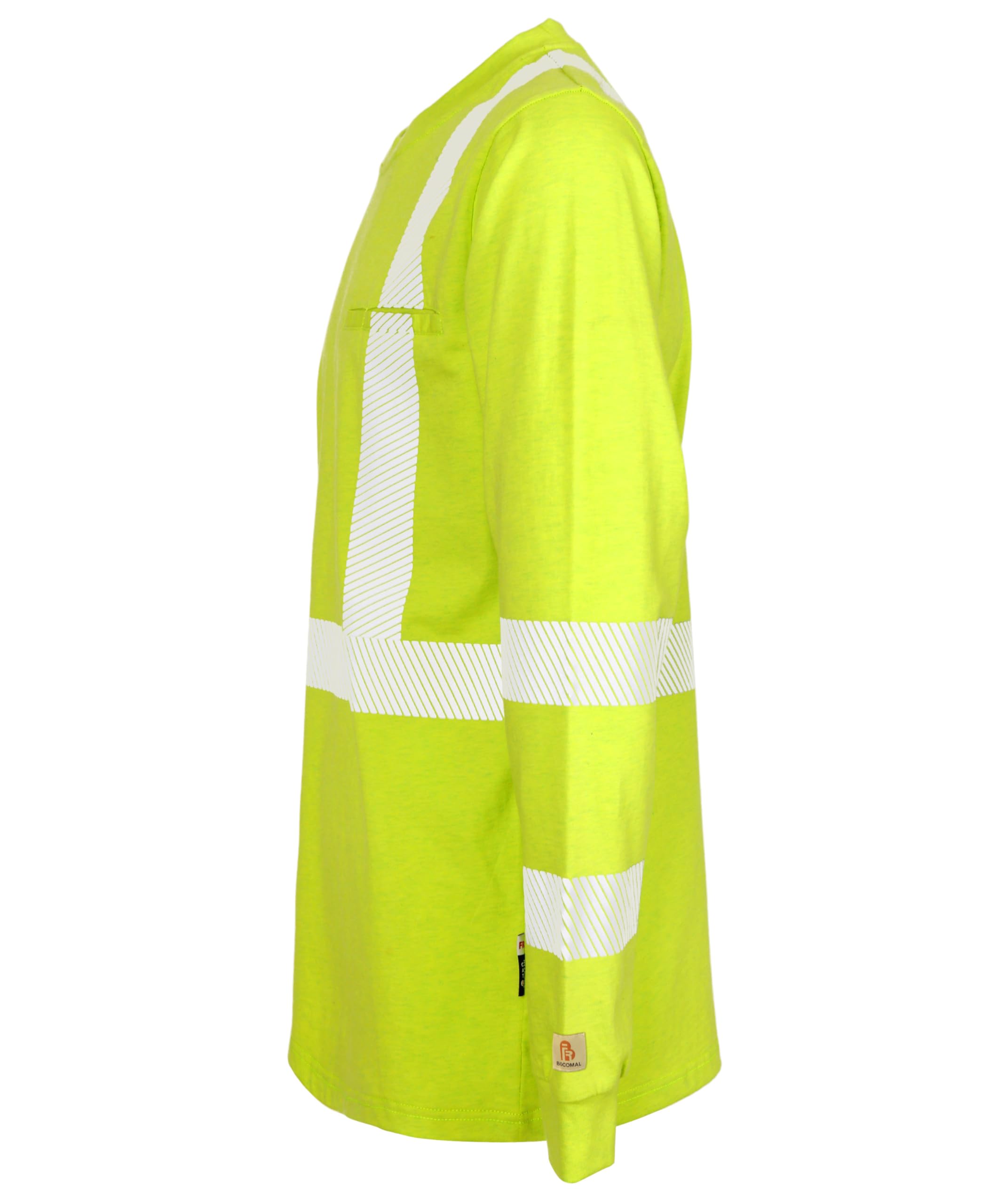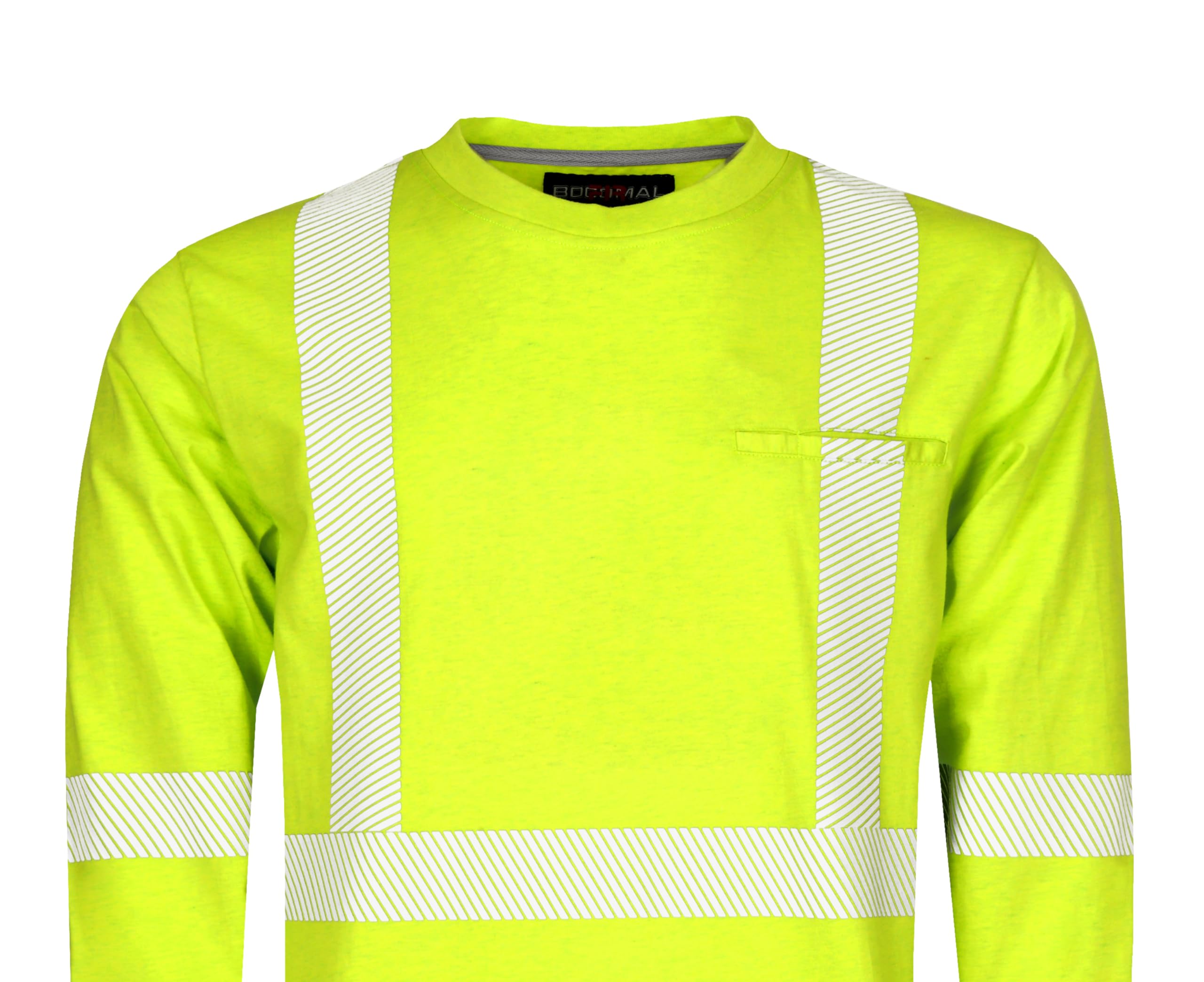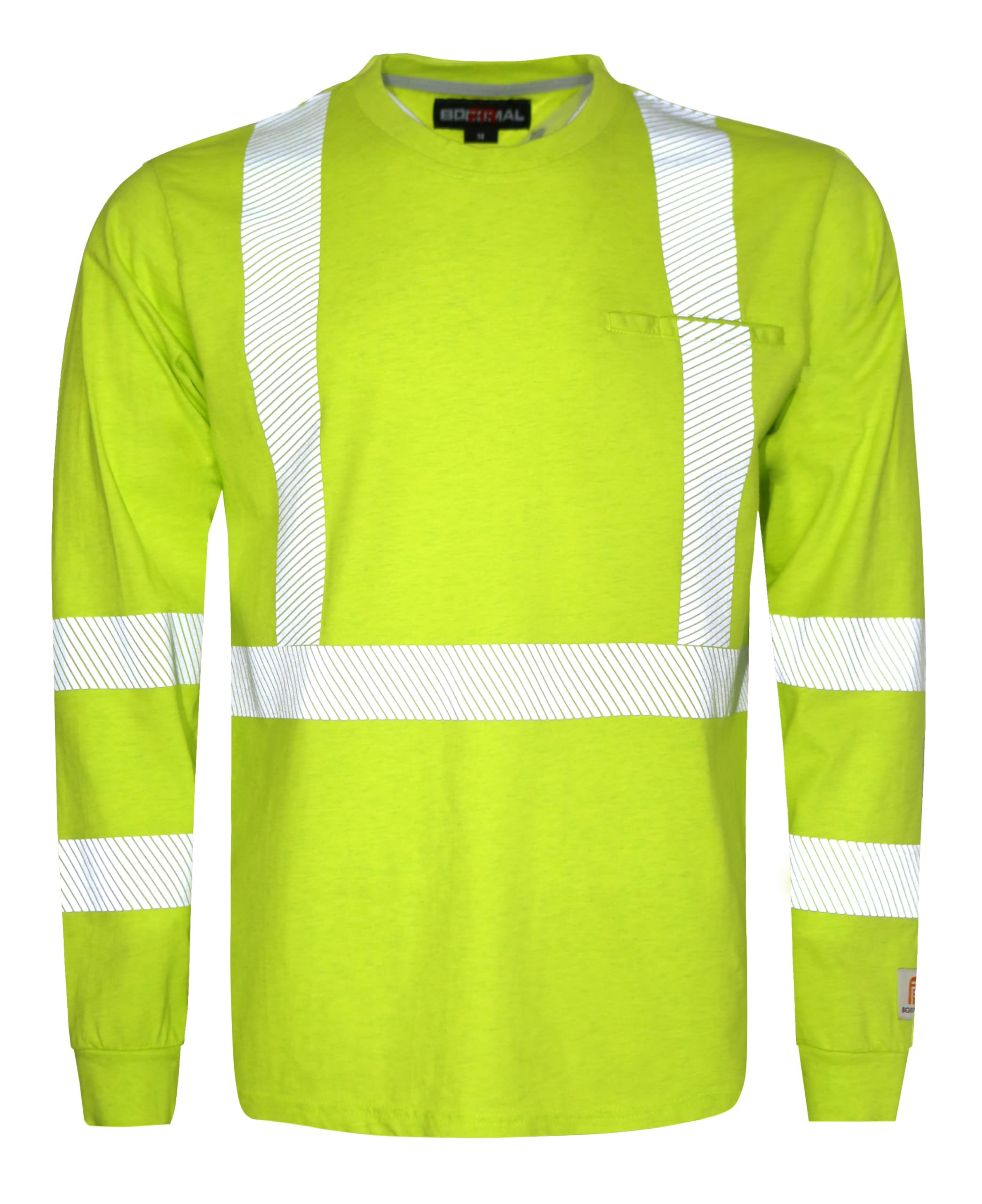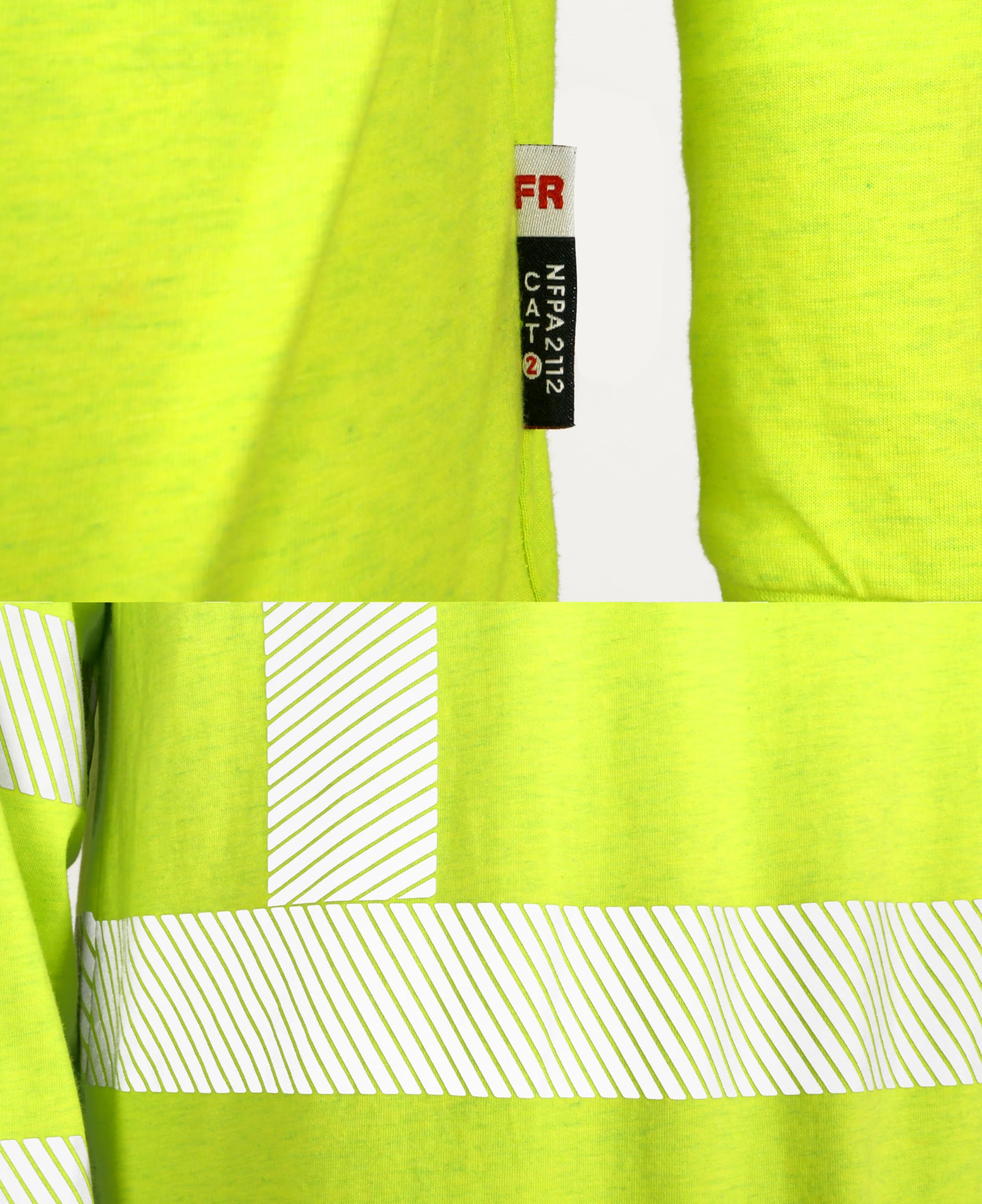 FR MATRIALS:6OZ Cotton Jersey FR Treated,FR Sewing Threads.2-inch Flame Resistant Silver Heat Seal Reflective trim!More area reflection on back and arm.Clear FR Tag on Front and More FR info on inside Tag About UL Certification.We Attached A Small Sample Inside Package For Cunstomers Simple FR Try