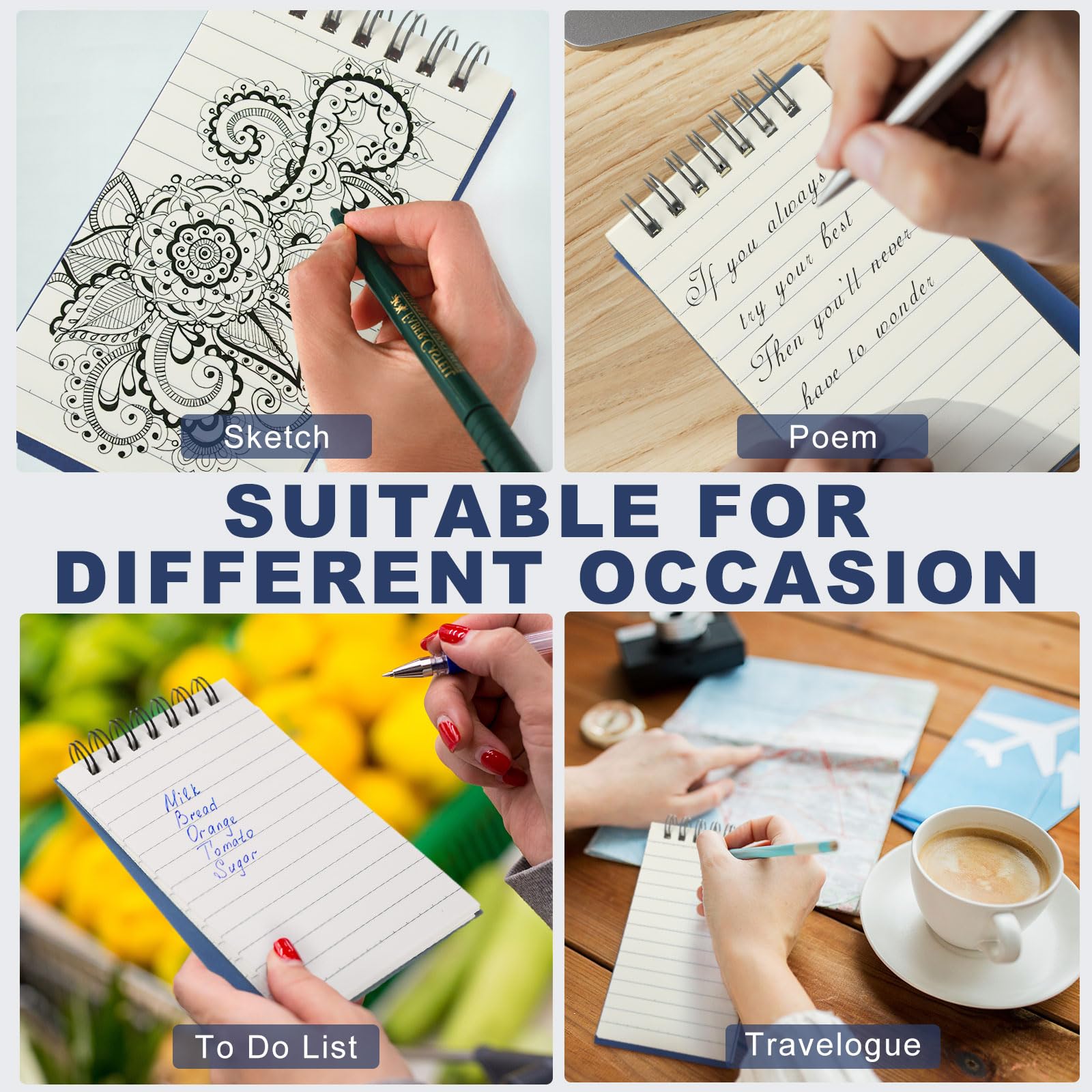 Wide Usage: the mini spiral notepad is ideal for journaling, note taking, poetry writing, sketching and painting, work notes, study notes, mood journals and more; It can be applied in home, office, school, college, business, conference, universities, remote meetings, and more; These mini notebooks make a practical gifts for travelers, neighbors, friends, business colleagues, teachers, or family