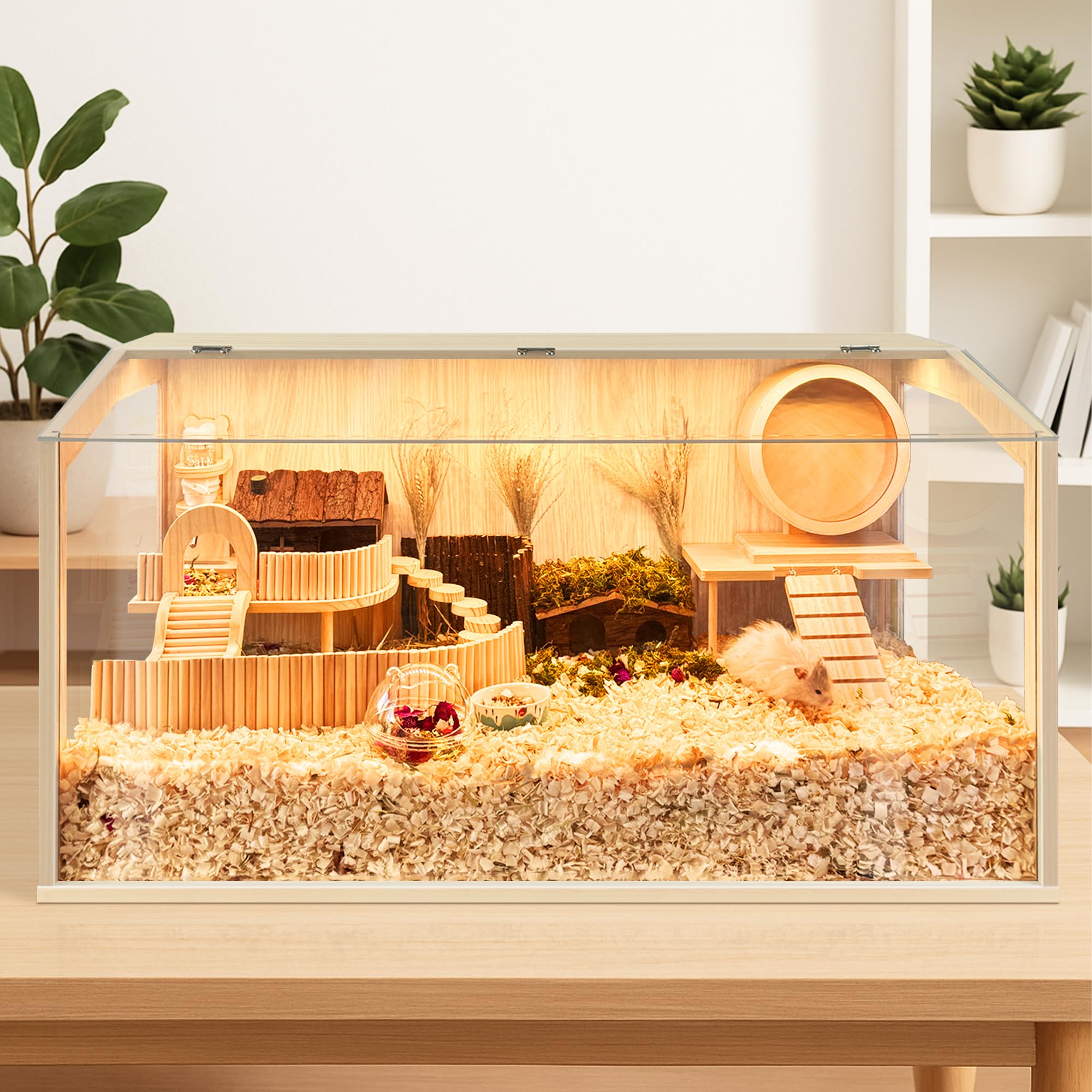 【Thick Bedding Matters】Research shows it’s best to have plenty of bedding so your hamsters can make a burrow just like they would in the wild. The extreme large interactive space of our cage is able to hold thick bedding and toy system for your pets to dig and explore. It's easy to arrange their hideout, sand bath area, hamster wheel, or exploring scene in the cage, which results in a far happier and less stressed hamster compare to the wire cage. We offer 4 different sizes, feel free to choose from 24-48in length. Note: The inner decoration is not included in the package