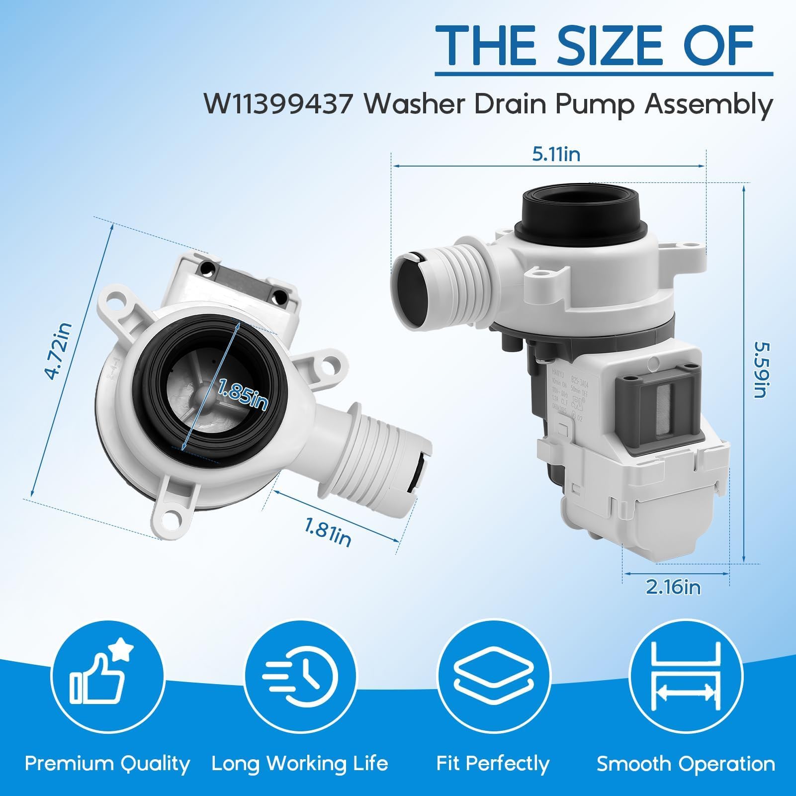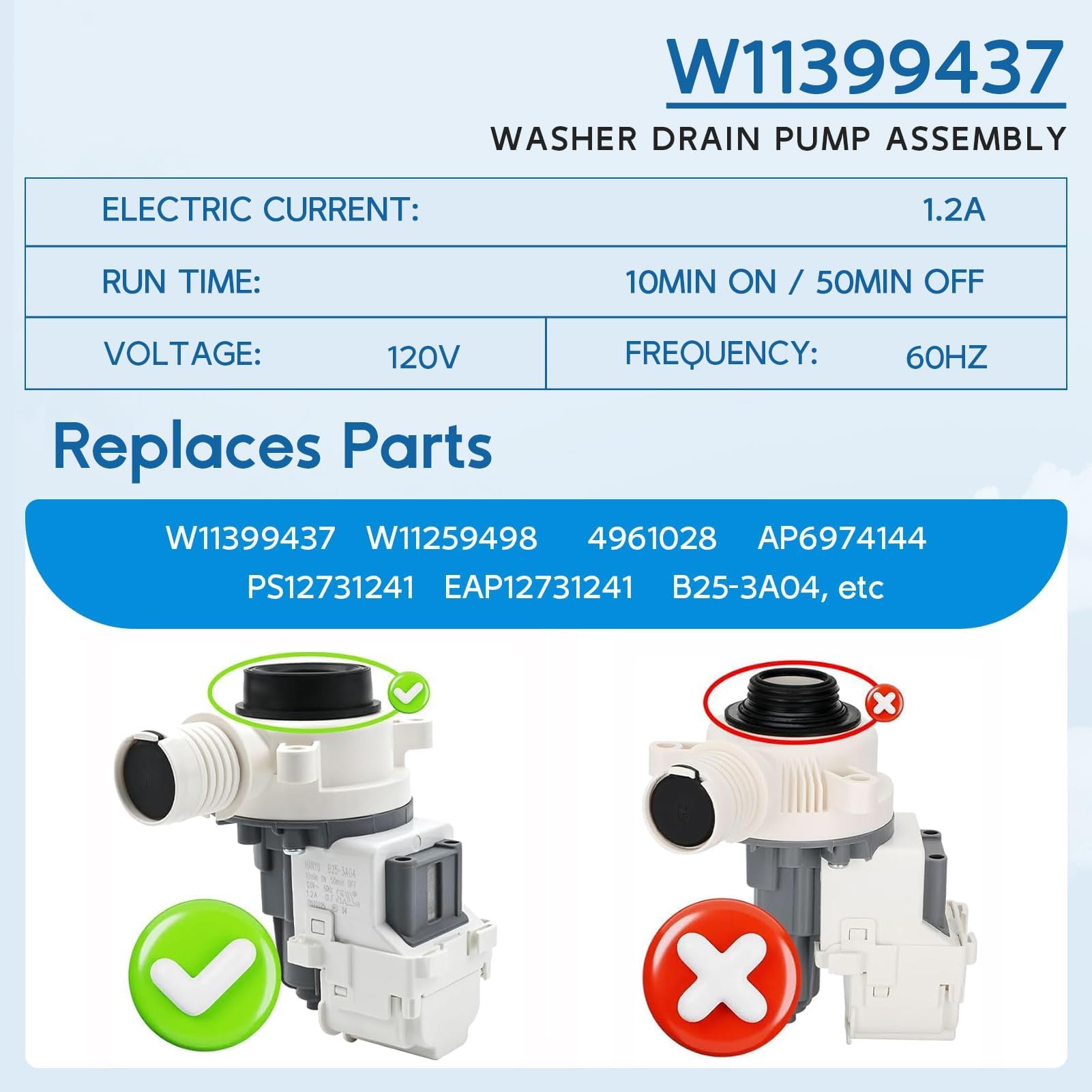 Replacement Part Numbers: W11399437 washer drain pump replaces W11259498 AP6974144 PS12731241 EAP12731241 washer parts.