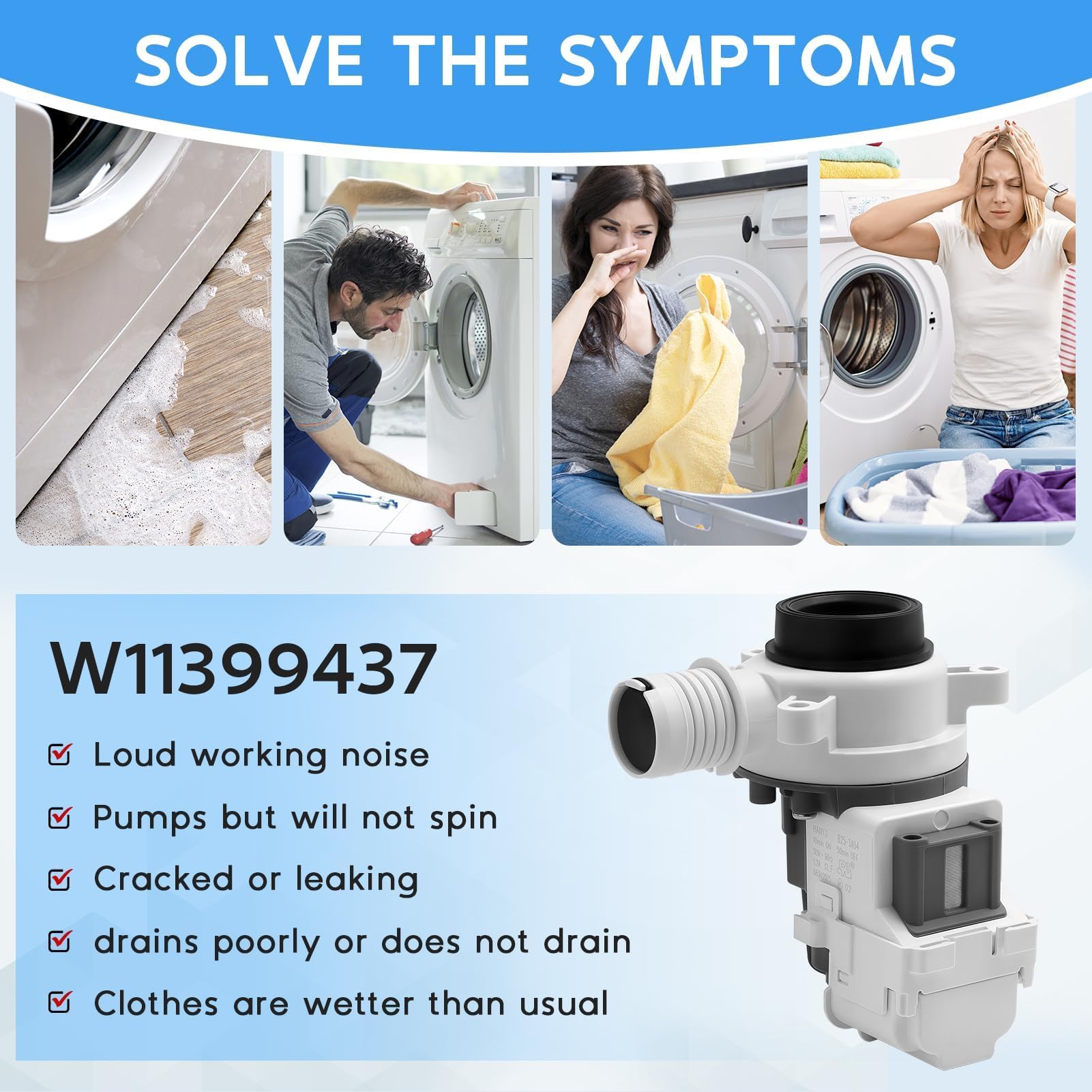 Solve Problems: W11399437 washer drain pump can fix the following symptoms: 1. Loud working noise 2. Drains poorly or does not drain 3. Cracked or leaking 4. Pumps but will not spin 5. Clothes are wetter than usual.