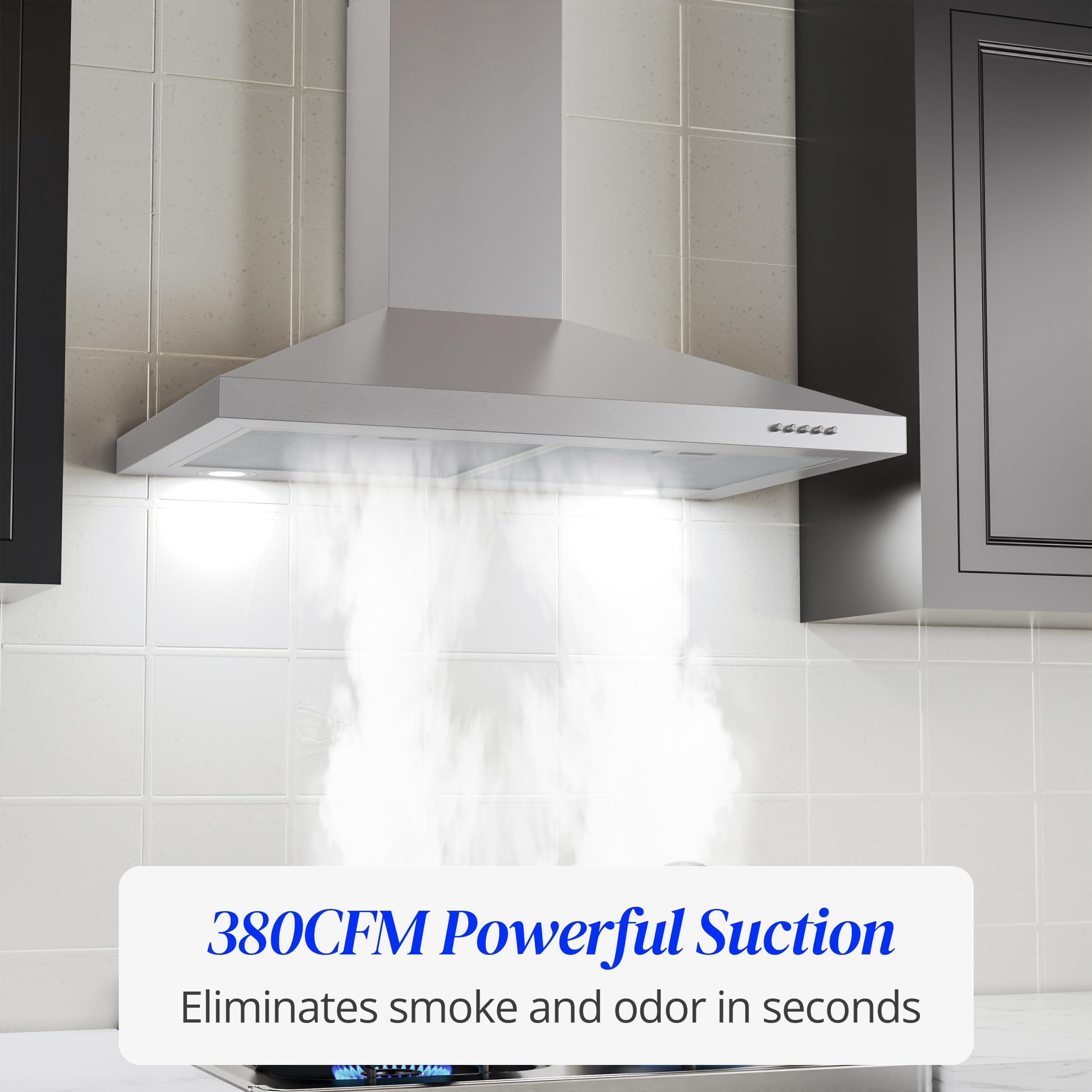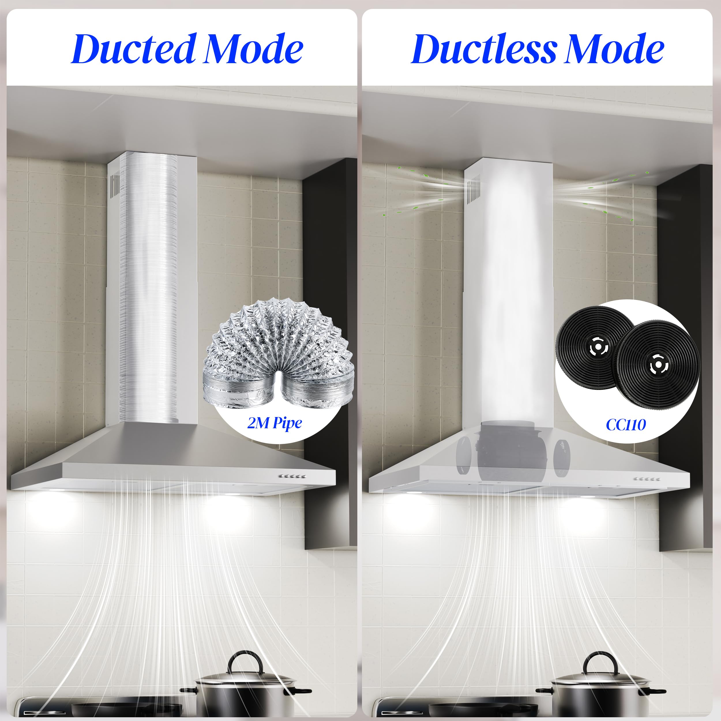HIGH-EFFICIENCY VENTILATION KITCHEN HOOD: This hood delivers powerful airflow up to 380 CFM, effectively removing smoke and odors to keep your kitchen fresh and clean. this kitchen vent hood offers two venting options. The 6-inch round top vent allows for external venting with the included 6.5-foot aluminum duct. Alternatively, install the included charcoal filters to convert it to a ductless range hood for recirculating air indoors