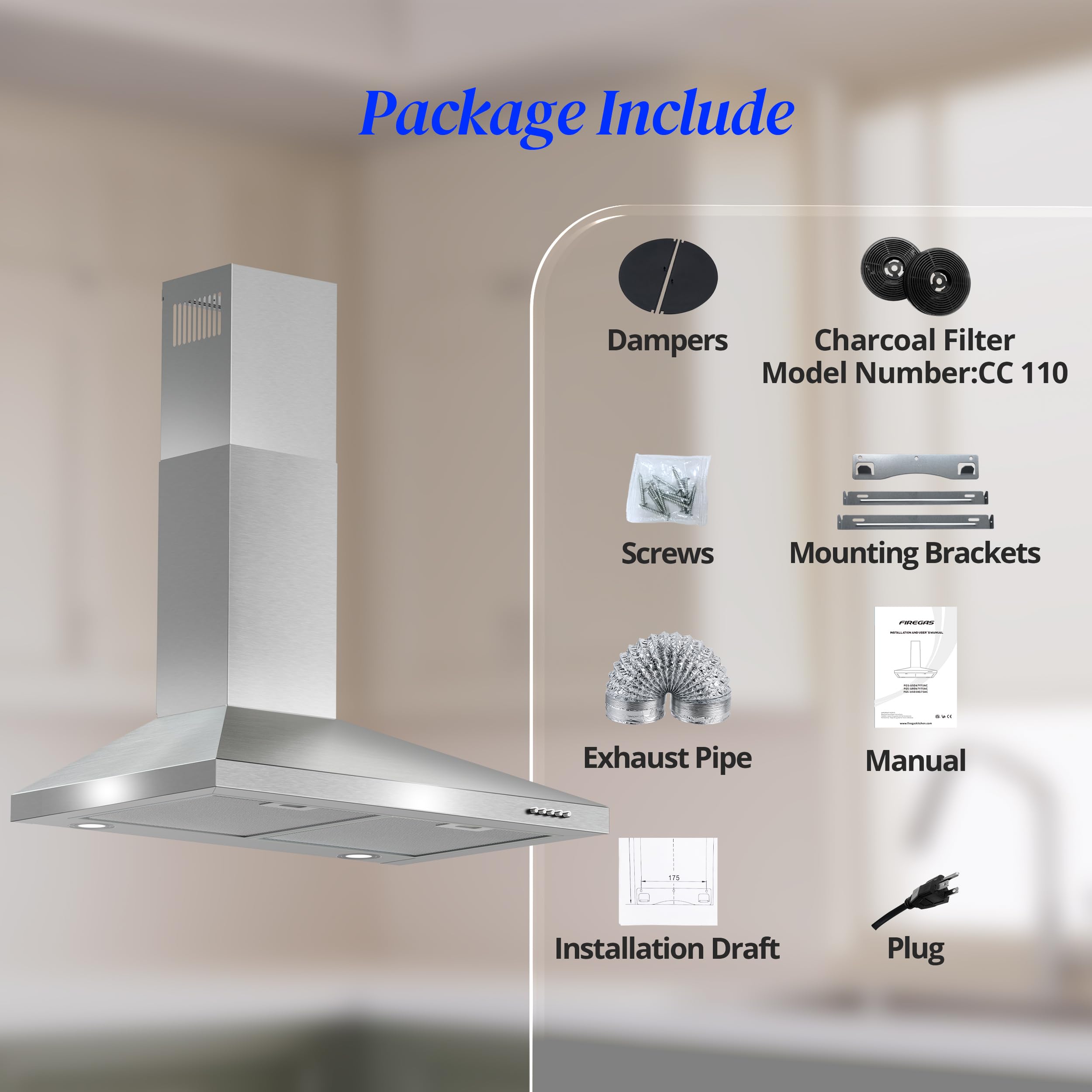 SLEEK CHIMNEY-STYLE WALL MOUNT DESIGN: This wall mount range hood mounts securely to your kitchen wall with a stylish chimney profile that complements both contemporary and traditional kitchens. Product Dimensions: 29.33 in. (W) x 18.99 in. (D) x Adjustable 22.56 in. - 36.34 in. (H). 120V/60Hz, 3-prong plug. FIREGAS range hoods come with a 2-year warranty. Contact us if you have any questions