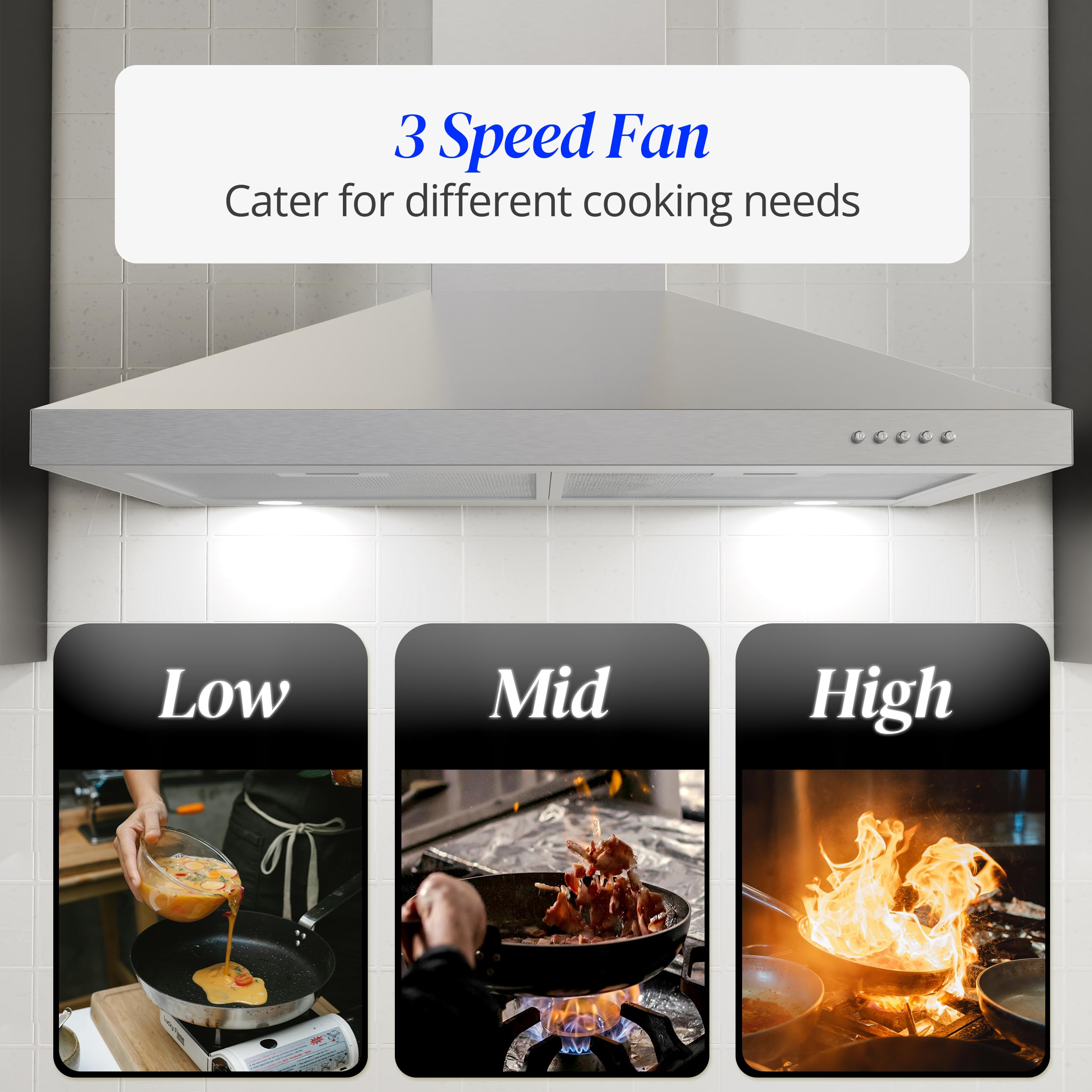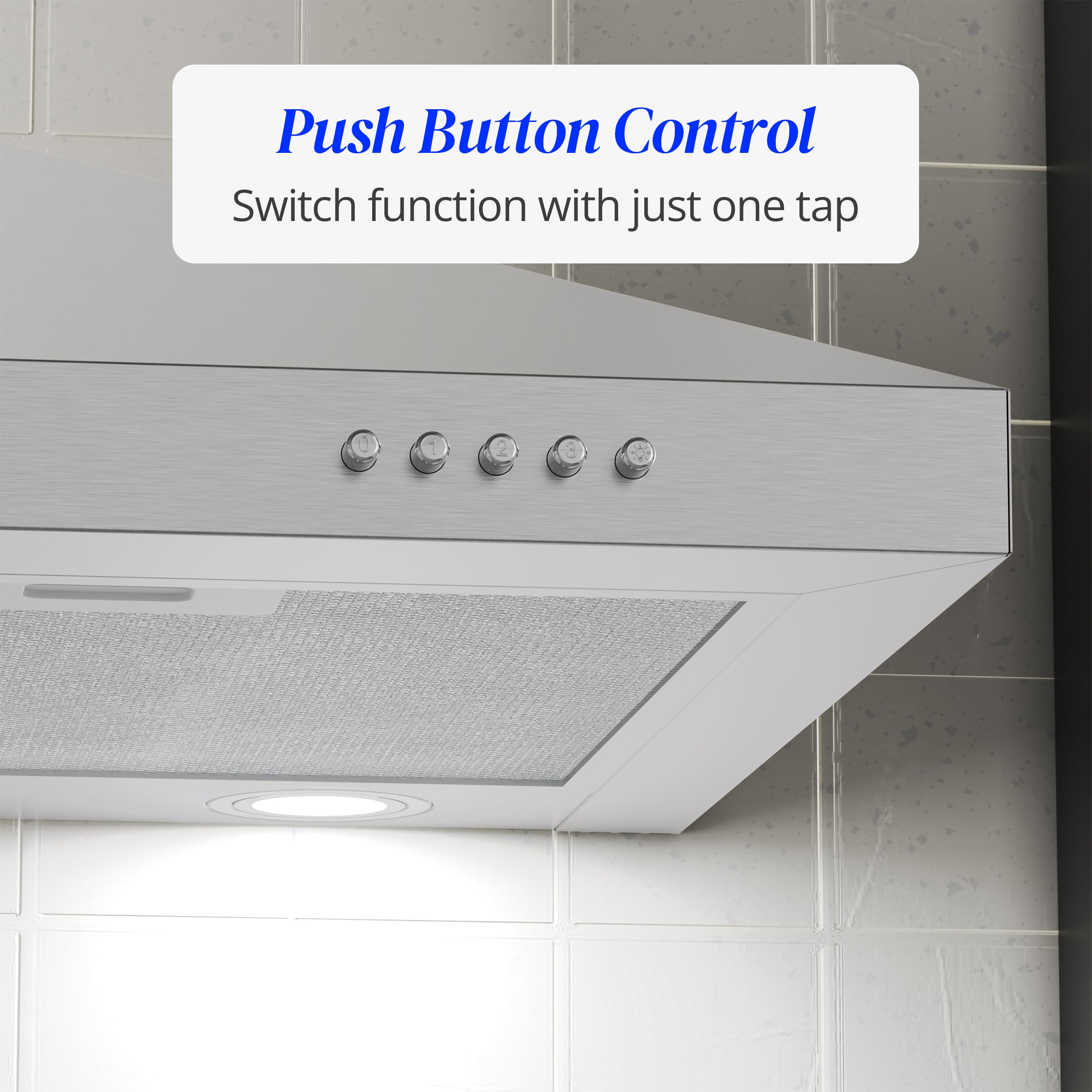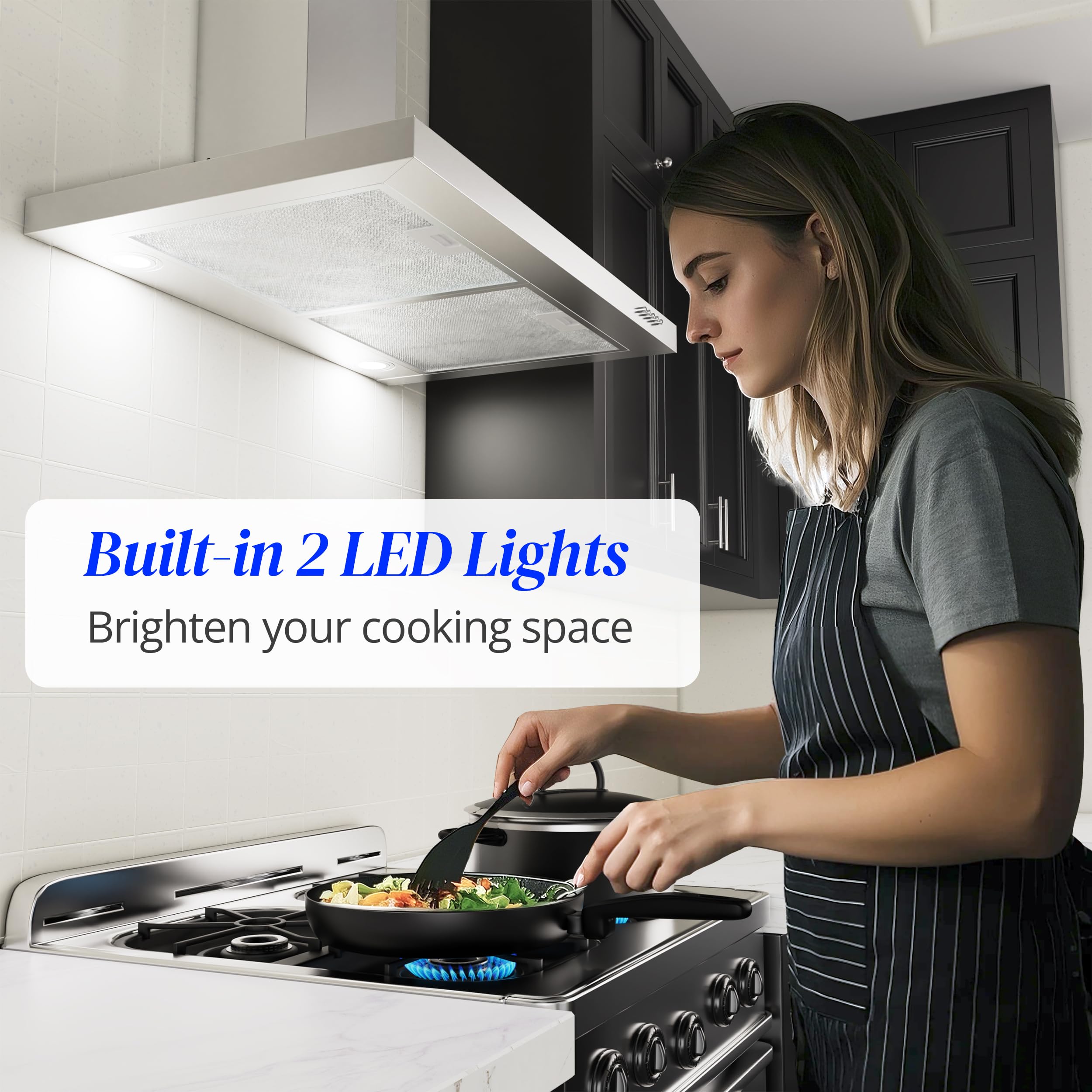 VENT HOOD WITH EASY BUTTON CONTROLS & BRIGHT LED LIGHTING: This range hood features a user-friendly 5-button control panel, allowing you to easily turn the hood on and off, adjust the kitchen exhaust fan speed to low, medium, or high, and control two energy-efficient LED lights for clearer nighttime cooking illumination