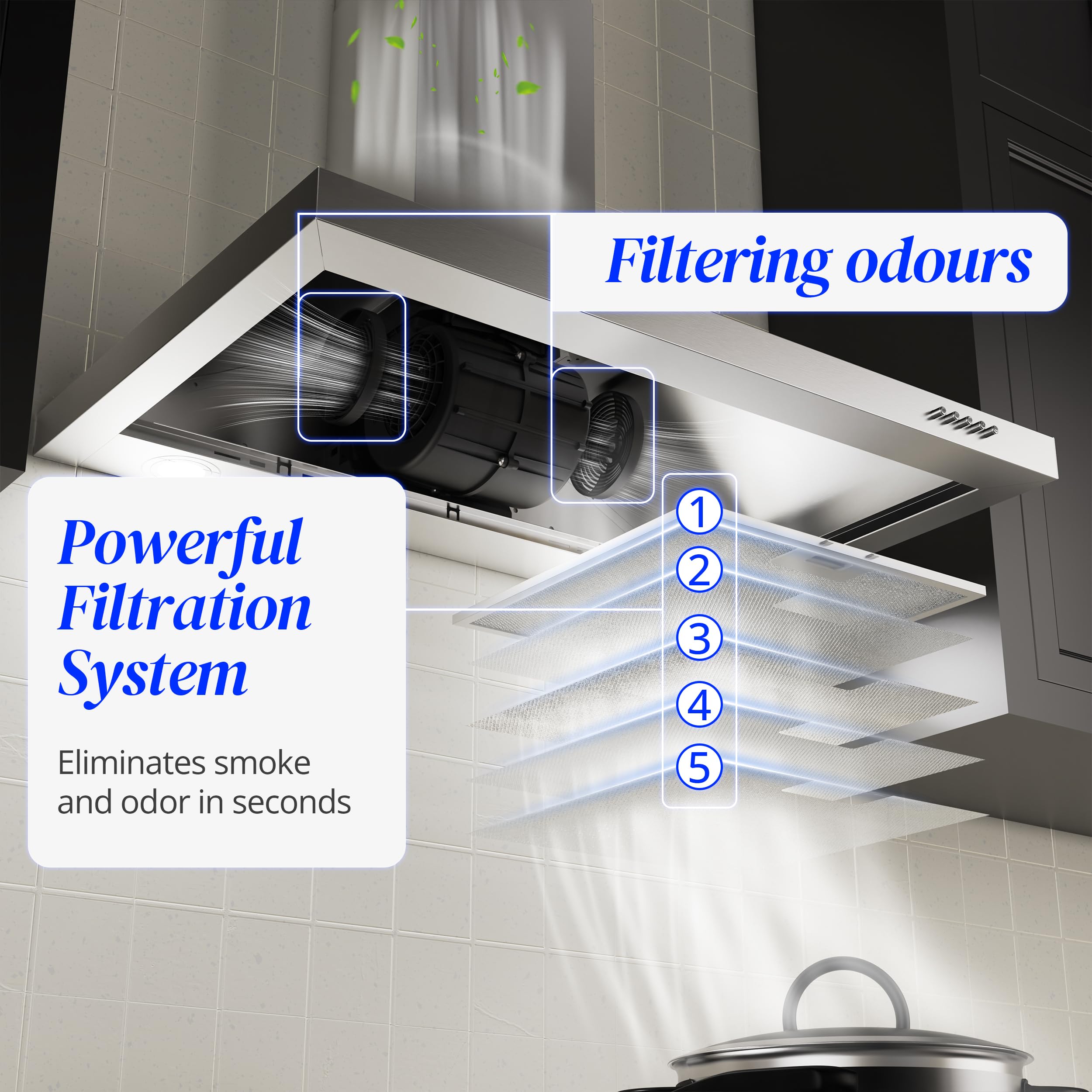 DURABLE ALUMINUM MESH FILTERS: The stove hood is equipped with two 5-layer aluminum mesh filters that effectively trap grease and smoke. These reusable filters are easy to remove and clean, helping you save on replacement costs. For the best performance of your kitchen hood vent, clean the filters at least once a month