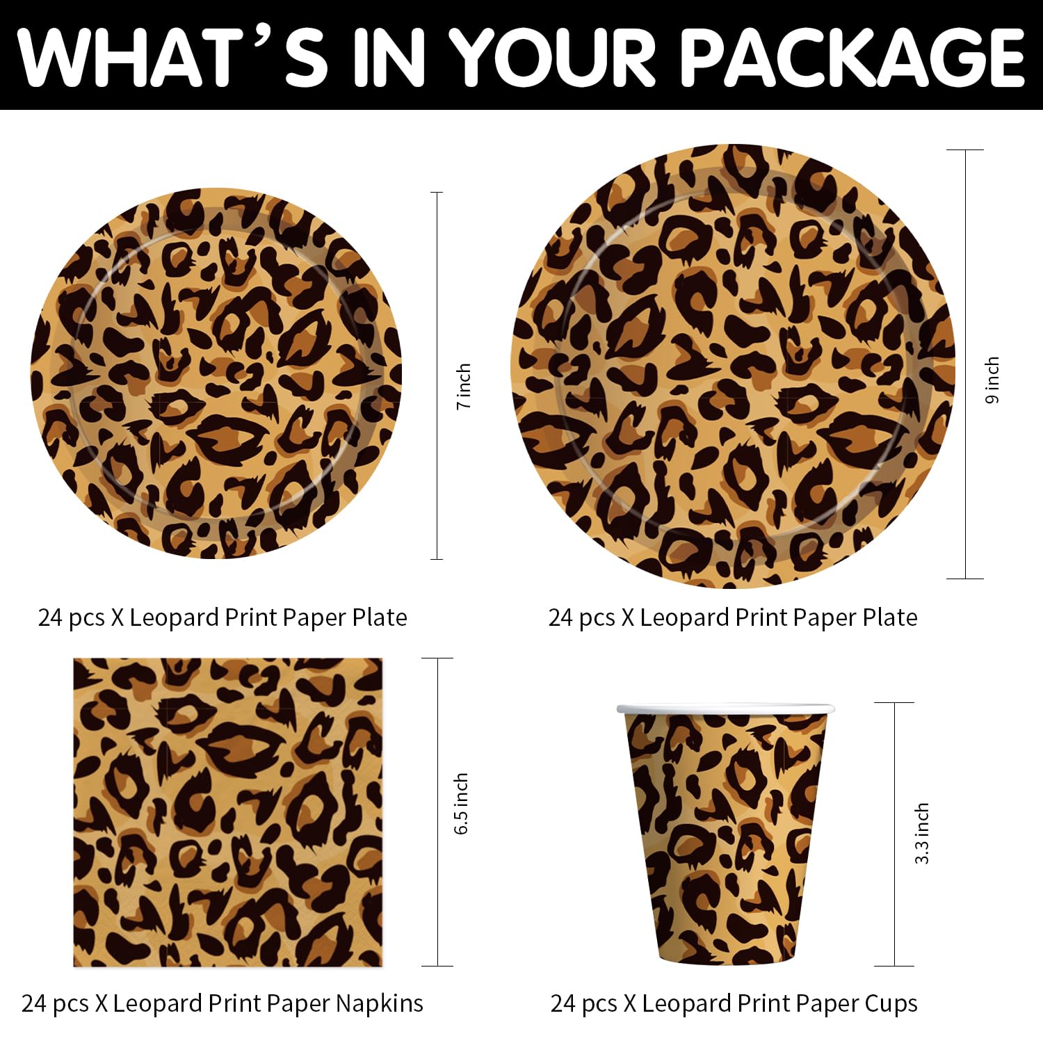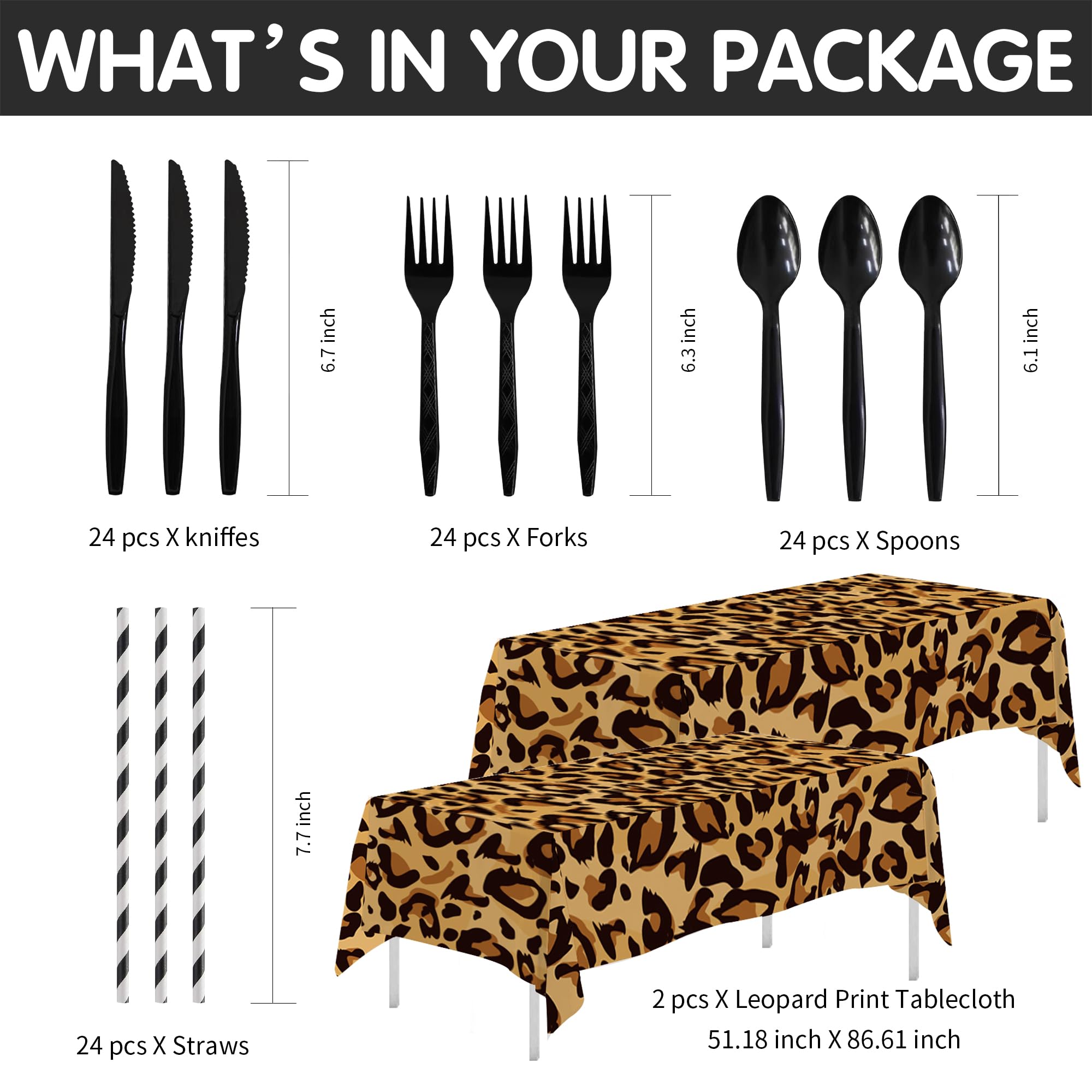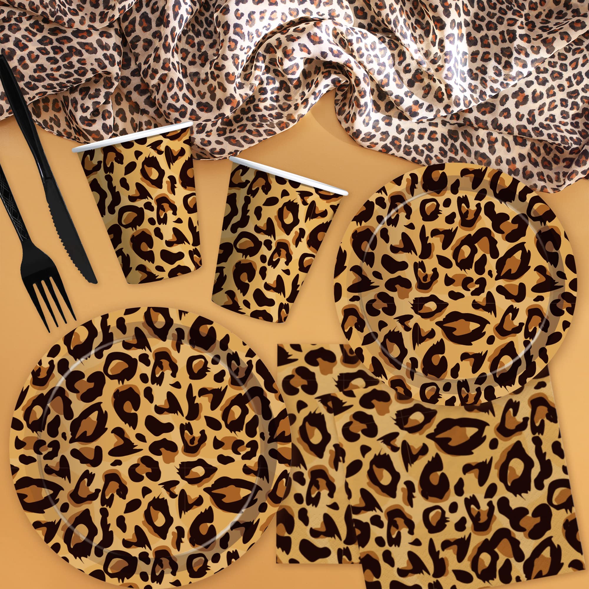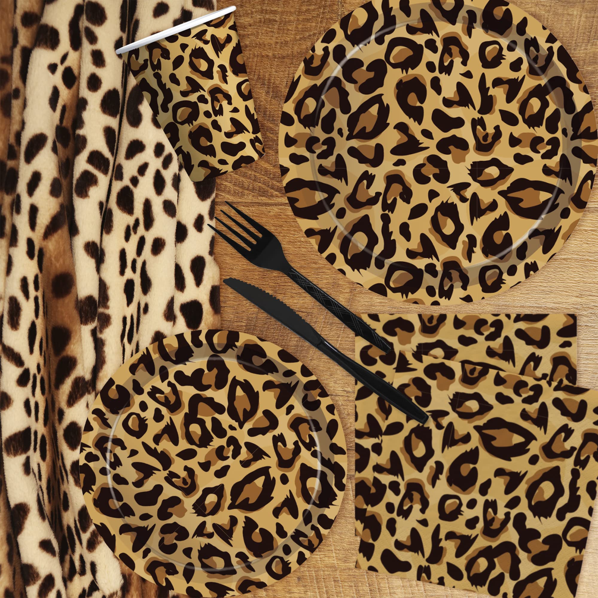 【Serve 24 Guests】This leopard birthday decorations dinnerware set can accommodate up to 24 guests and includes everything you need: 24pcs 9'' leopard dinner plates, 24pcs 7'' leopard dessert plates, 24pcs napkins, 24pcs cups, 24 sets of cutlery, 24pcs paper straws, 2pcs leopard print tablecloth