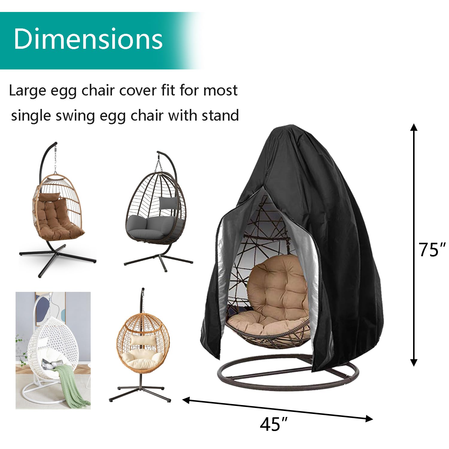 Universal Size for Most Egg Shaped Swing: 75" x 45". This hanging chair cover fits most kinds of single swinging egg chair, pod chair, swingasan, suitable for most of the hanging chairs