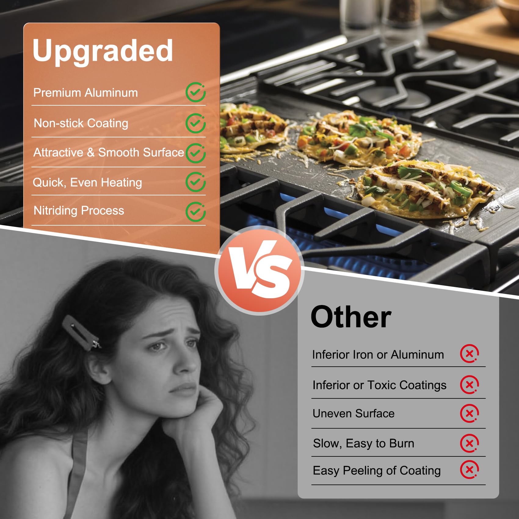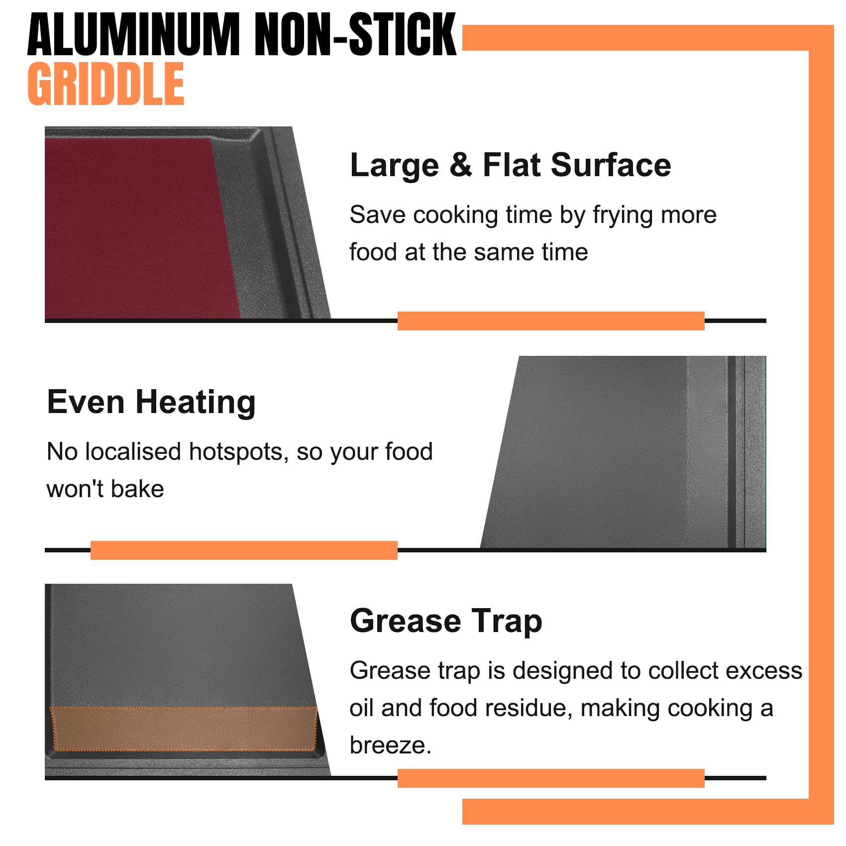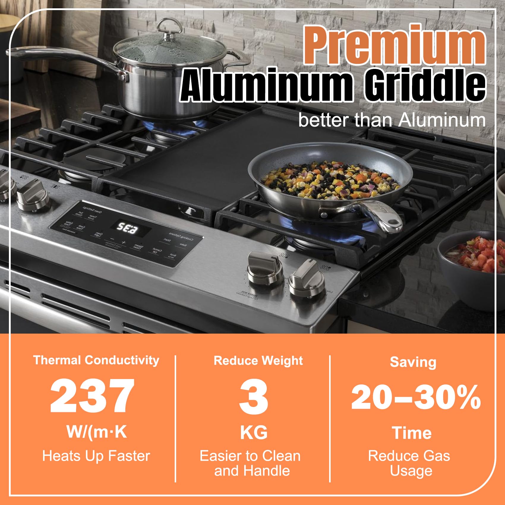 【Premium Aluminum】WB31X24738 griddle is made of die-cast aluminum with a thermal conductivity of 237 W/(m·K). Its excellent heat conduction performance allows it to heat up faster, reducing cooking time by 30% and gas consumption. At the same time, the hard anodized finish gives it excellent strength, making it resistant to deformation and scratches.