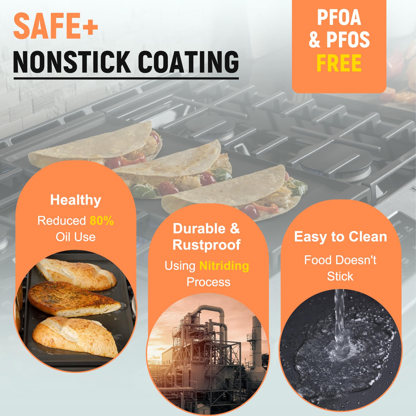 【Upgraded Nitrided Non-Stick Coating】The surface of the WB31X24738 stove griddle features an upgraded food-grade non-stick coating that has undergone high-pressure nitriding treatment. This not only provides convenient and safe non-stick functionality without the need for frequent maintenance or seasoning but is also more durable than ordinary coatings!