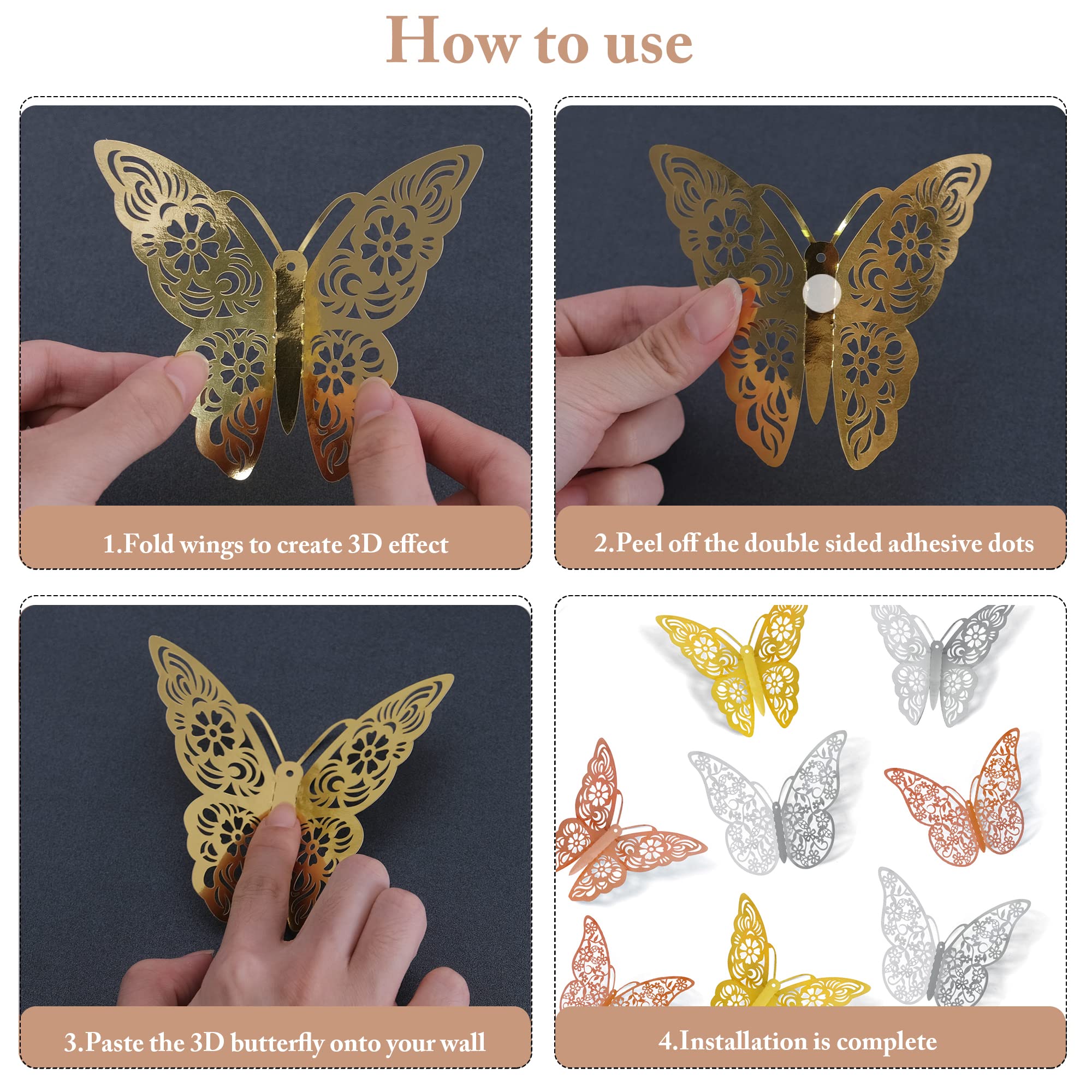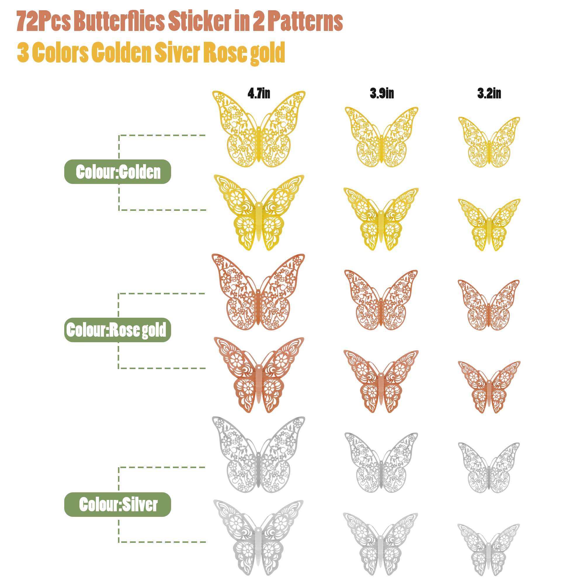 【Package Included】72pcs butterfly wall stickers: 36 pcs Style 1, 36 pcs Style 2, each style has 3 sizes(3", 4", 5") and each size has 4pcs. Coming with 72pcs double sided adhesive dots.
