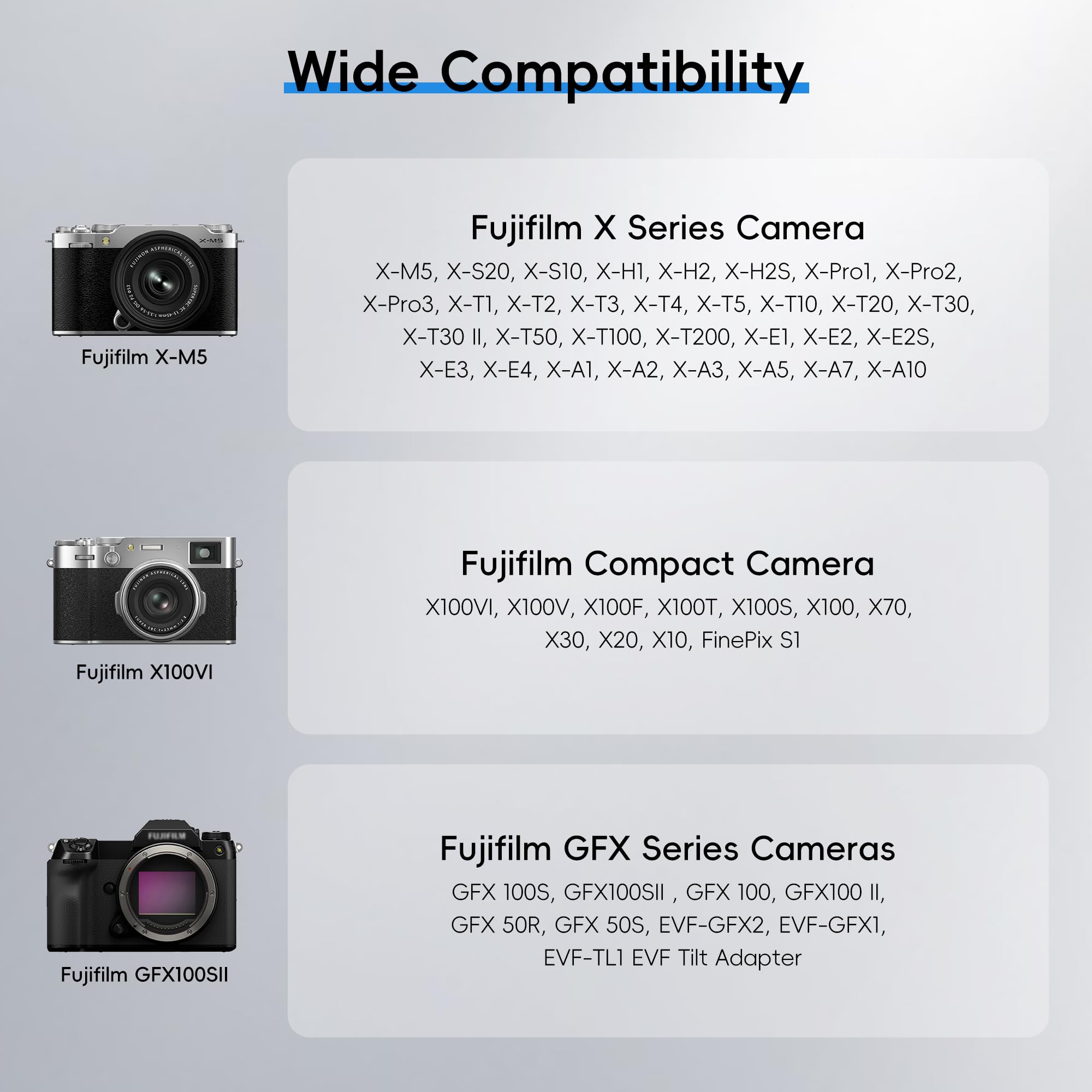 The hot shoe cover is compatible with Fujifilm X-M5, X-T50, X-T30 II, X-T30, X-T20, X-T5, X-T4, X-T3, X-T2, X100VI, X100V, X100, X-T200, X-T100, X-PRO3, X-PRO2, X-PRO1, X-E3, X-E2, X-E1, X-A1, X-A2, X-A10, X-S20, X-S10, X-A5, X-H1, X100F, X100S, X10, X30, X70, GFX 50S ,etc.