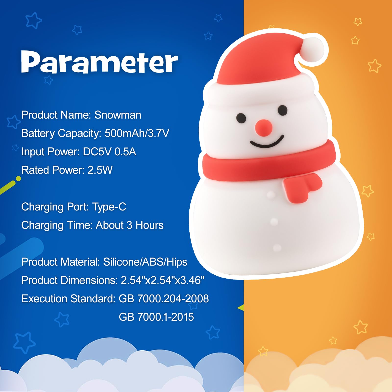 Combining colorful RGB light mode and warm light mode, Gefaxi squishy Christmas snowman night light is eye-catching on a shelf and calming by the bed, is great for anyone looking to add warmth and fun to their space. Whether you need a soft nightlight glow to wind down after a long day or a pop of color to liven up a party, this little fun snowman lamp does it all. 1. The discreet hanging loop lets you suspend it from a real Christmas tree branch or wall hook for extra whimsy. 2. The comfortable silicone shell is fun to touch and squeeze without damage, helps you relieve stress. 3. The built-in 500mAh rechargeable battery provides 120 hours of glowing ambiance on a full charge. No matter who you're shopping for, this playful snowman lamp turns everyday lighting into an instant festive celebration. Product Name: Gefaxi Christmas Snowman Night Light Battery Capacity: 500mAh/3.7V Input Power: DC5V 0.5A Charging Port: Type-C Rated Power: 2.5W Charging Time: About 3 Hours Product Material: Silicone/ABS/Hips Product Dimensions: 2.77"x2.77"x3.90" Applicable Places: Bedroom, Nursery, Living Room, Study Room, Entryway, Hallway
