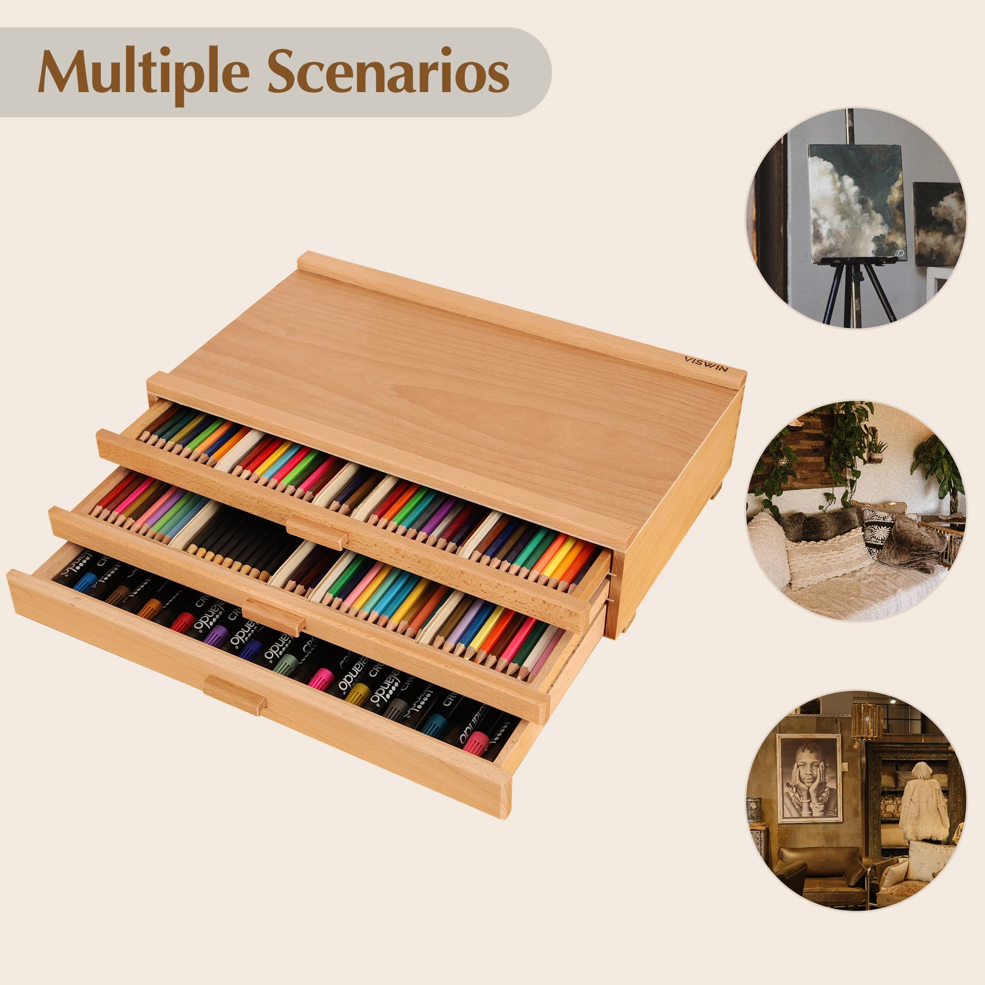 [Fine Craftsmanship] The wood art storage box is made of high-quality German beech wood, which is sturdy and durable. Each wooden storage box is meticulously crafted with utmost care and attention to detail. All the art supplies organizer drawers fit and slide in and out nicely. The inner and external surfaces are all hand-polished down to a flat finish without burrs or sharp edges. Not only the exquisite wood artist supply storage box has a good appearance, but also inner details.