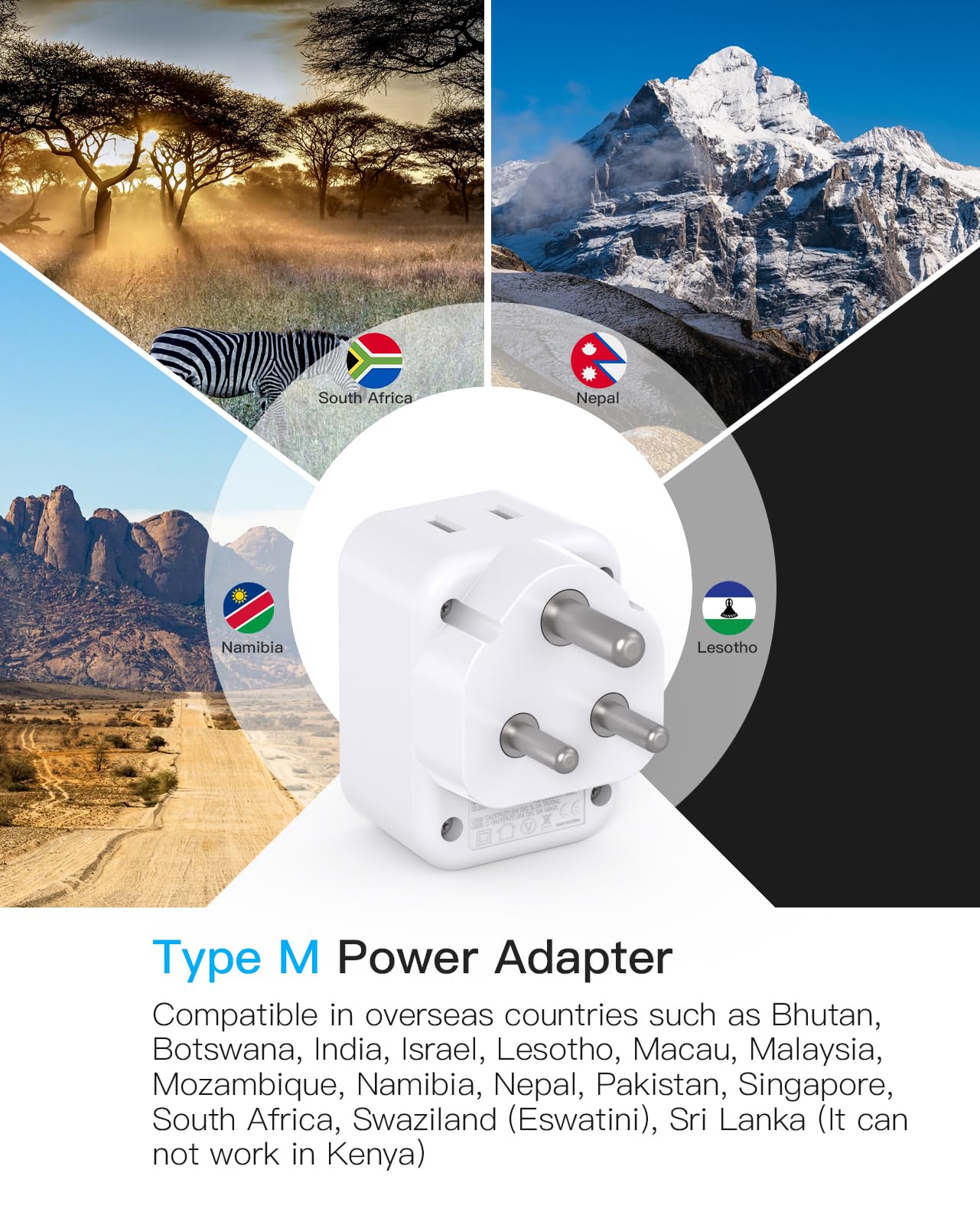 【US to South Africa Power Adapter】- This South Africa plug is compatible in overseas countries such as Bhutan, Botswana, India, Israel, Lesotho, Macau, Malaysia, Mozambique, Namibia, Nepal, Pakistan, Singapore, South Africa, Swaziland (Eswatini), Sri Lanka (It can not work in Kenya)