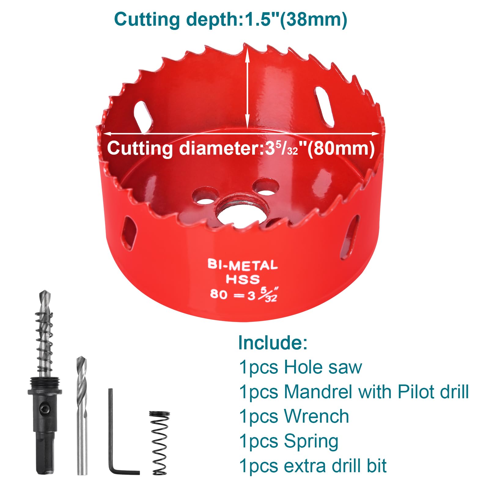 HOLE SAW: Our high-speed steel sharp cutting teeth effectively drill through metal, wood, cornhole boards, PVC board, plastic, drywall, and more. The hole saw set includes 1* 3-5/32'' hole saw, 1*arbor(with 1 drill bit), 1*drill bit for replacement, and 1*hex key.Cutting diameter is 3-5/32" / 80mm, opening depth is 1.5" / 38mm.