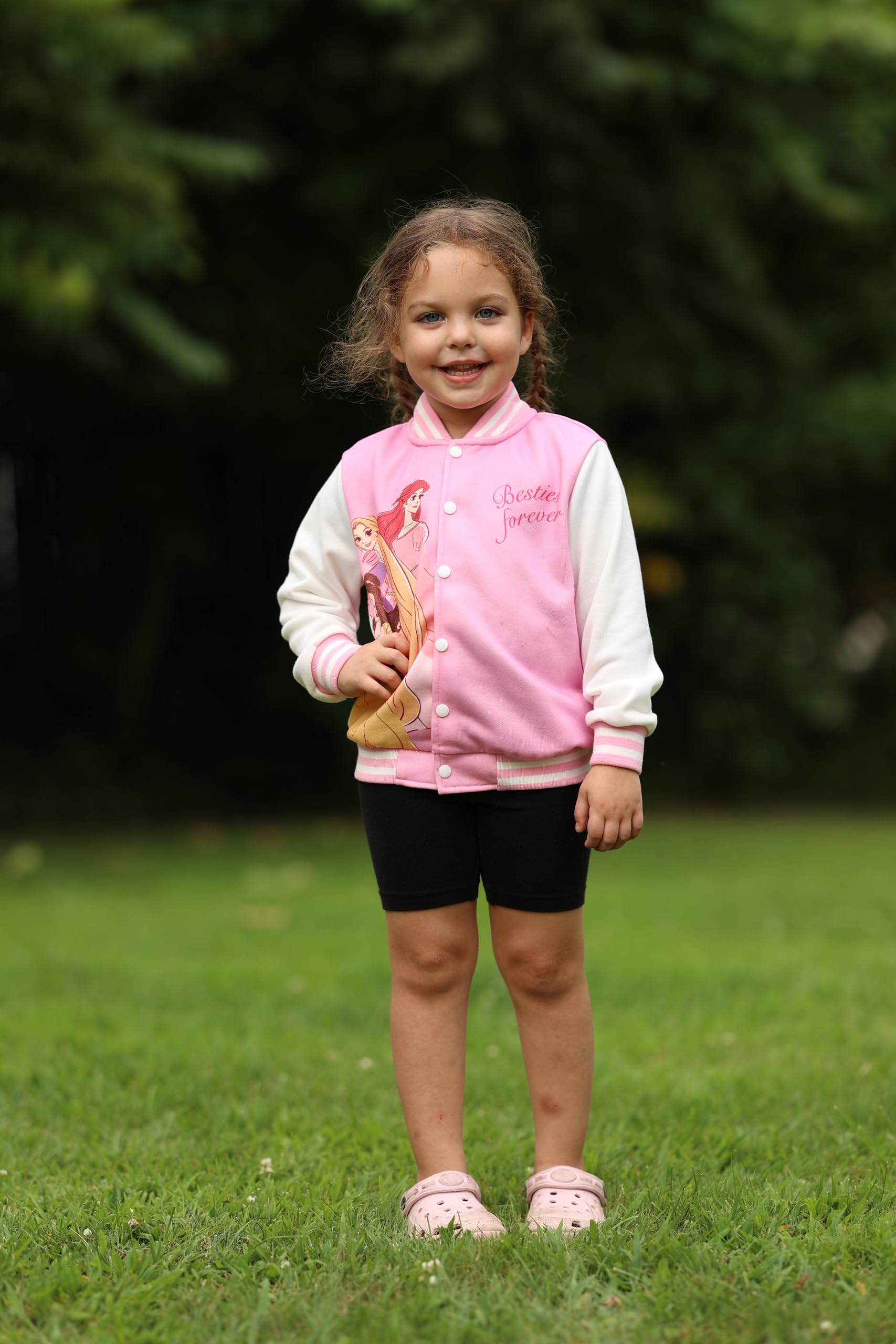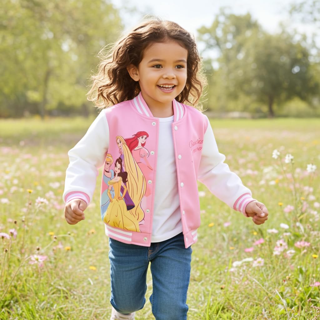 Charming & Friendship-Focused Design: Let your little one feel like a princess with this Disney Princesses Forever varsity jacket! Featuring Ariel, Belle, Rapunzel, and more, this pink jacket celebrates friendship with the “Besties Forever” message. Ideal for kids aged 2-6, it’s perfect for school, outings, or play, offering both style and comfort for every young Disney fan