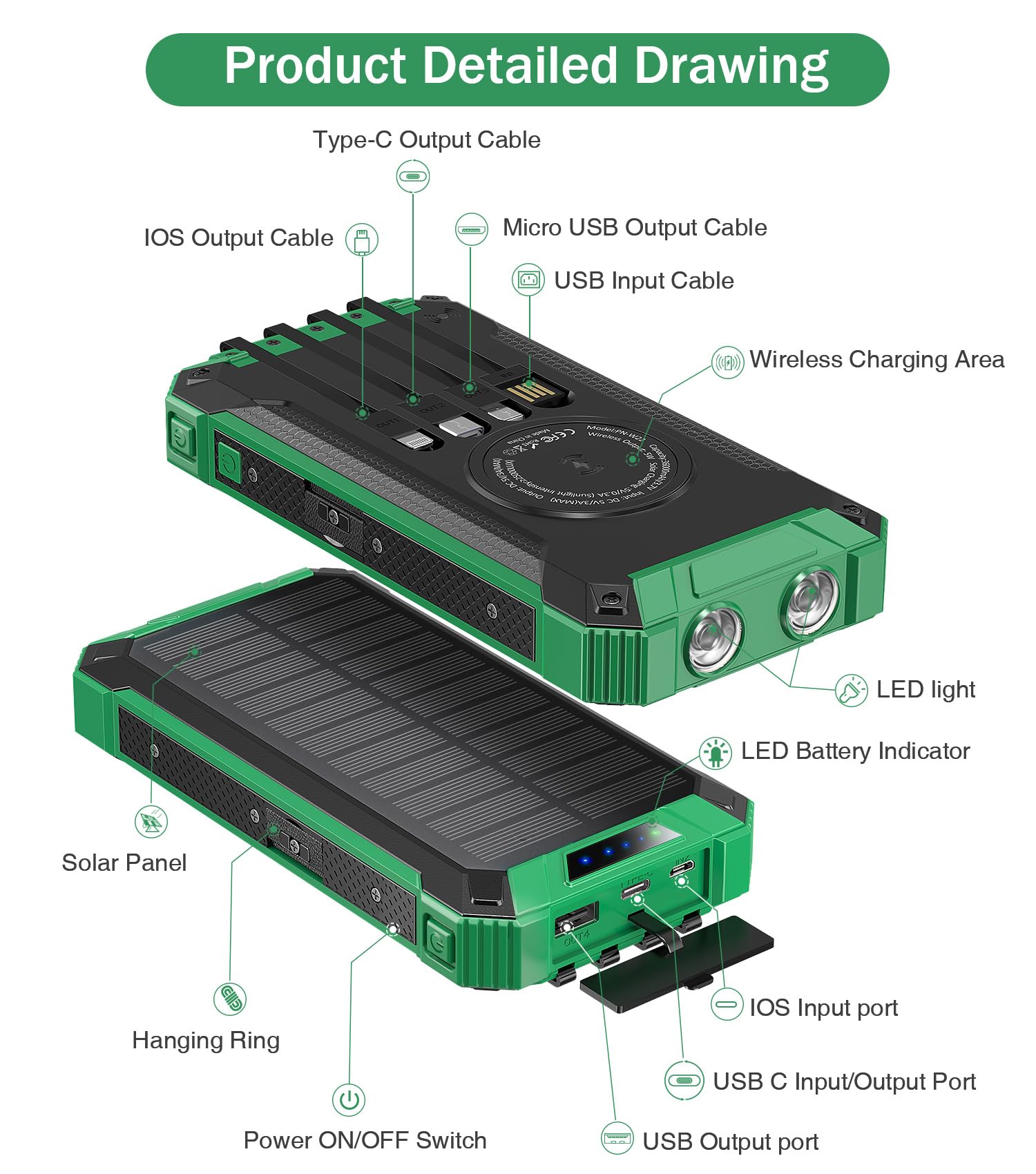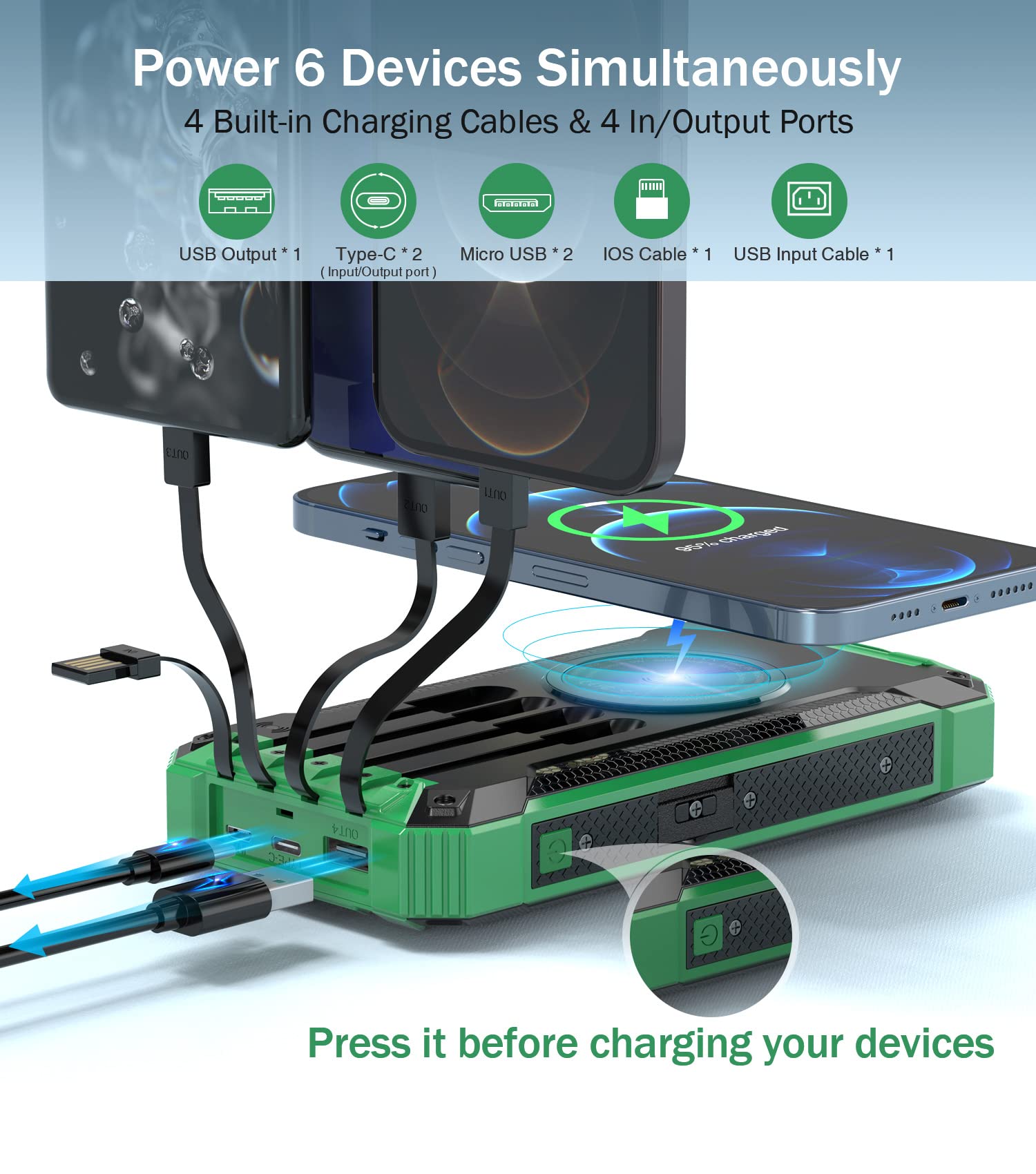 [Power 6 Devices at Once] This solar charger is also equipped with 4 ports (iOS input, USB A output, USB C input/output), providing 5V/3A high-speed charging to save time. Along with 4 charging cables and wireless charging, it supports charging 6 devices simultaneously. Keep all your devices alive. Sharing with families and friends is perfect.