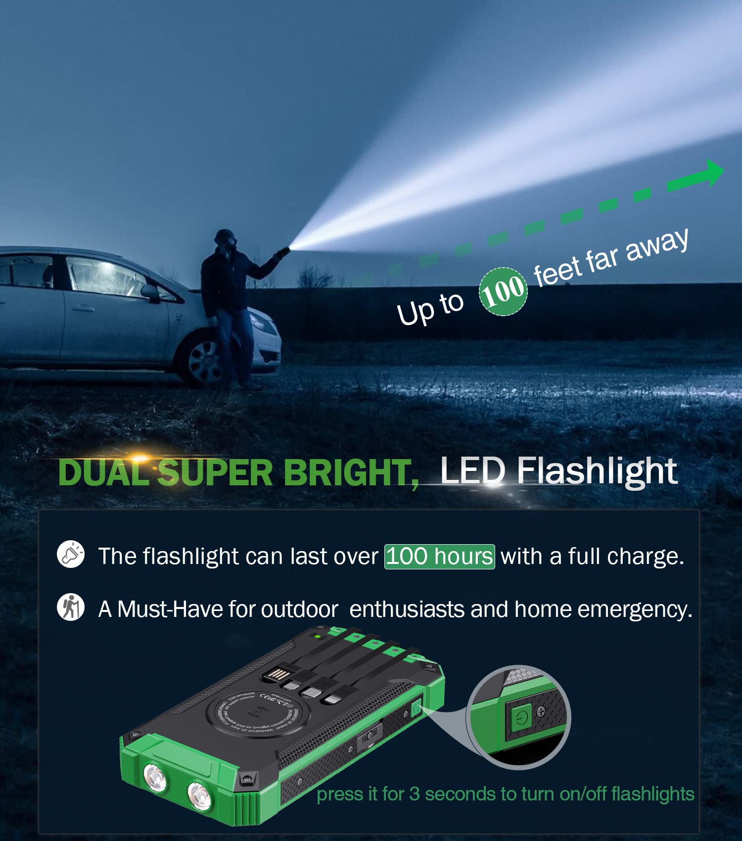 [Sturdy&Durable Design for Outdoor] This solar battery pack is well made to be Waterproof/Shockproof/Dust-proof, which can withstand the harsh environment outdoors. It’s equipped with Dual super bright LED lights, a Must-Have tool for outdoor activities and home emergencies.