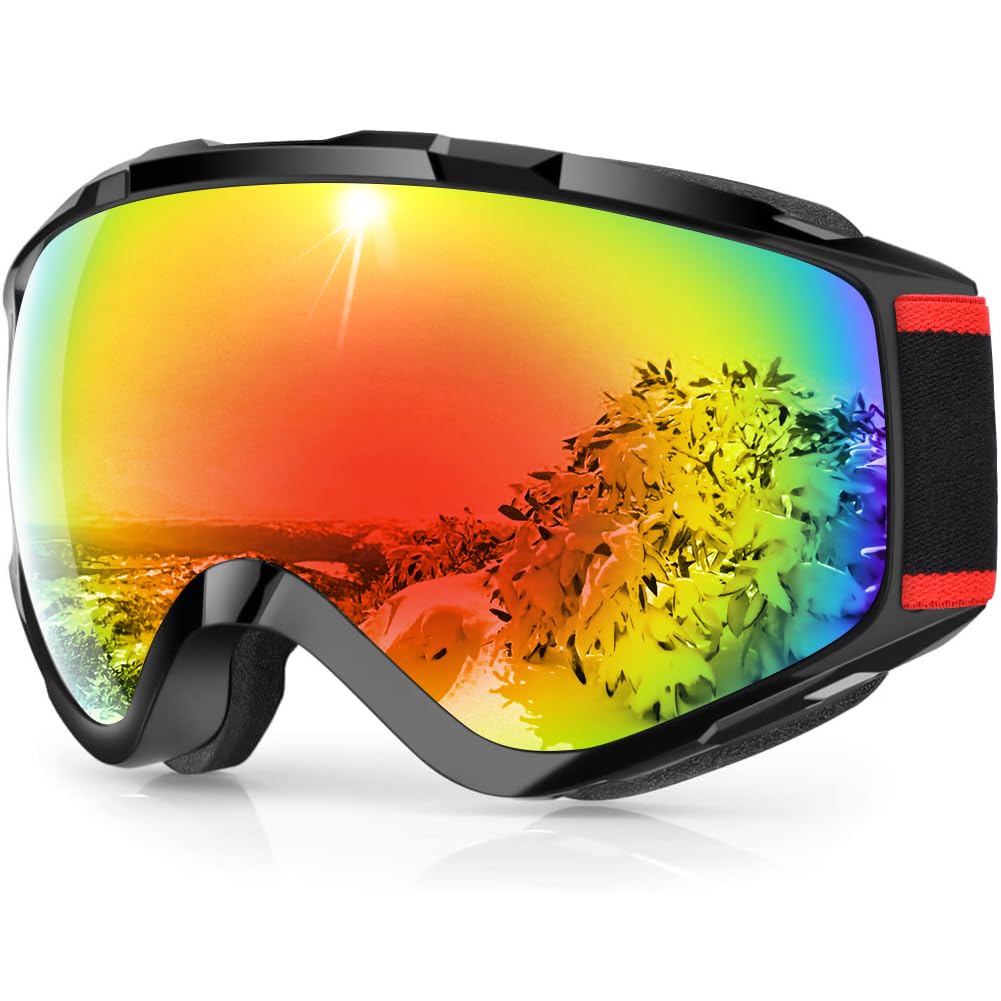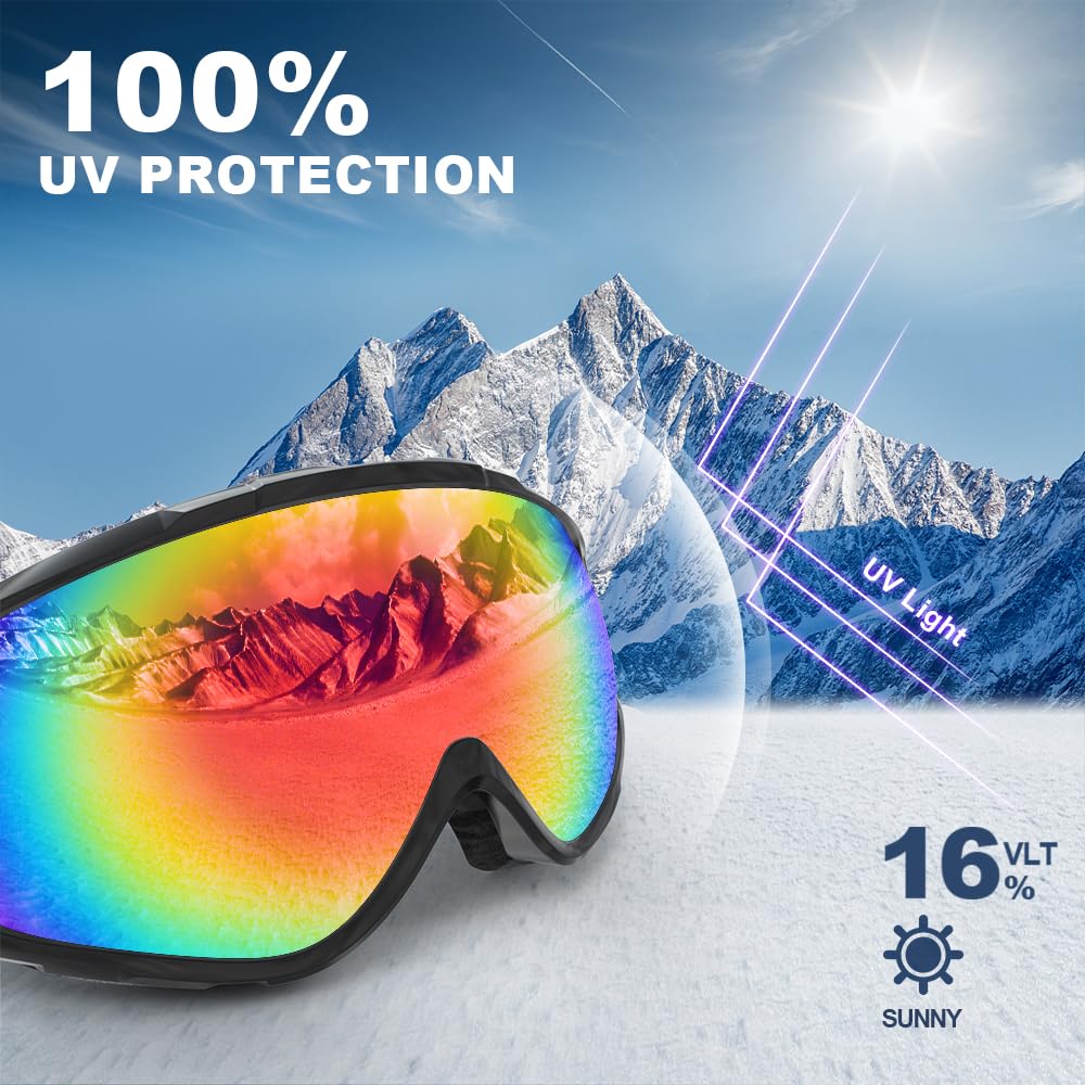 【Performance Double Lens】-Anti-scratch,anti-fog,impact resistance,full face real revo mirror coating reflective lens,100% UV protection,more solid & durable than others ski goggles.The inner lens made by Italy with PRO long-lasting anti fog performance materials,working with ventilation system.NO fogging up when skiing or snowboarding.Great optical clarity spherical lens and frameless design create a super wide HD vision.
