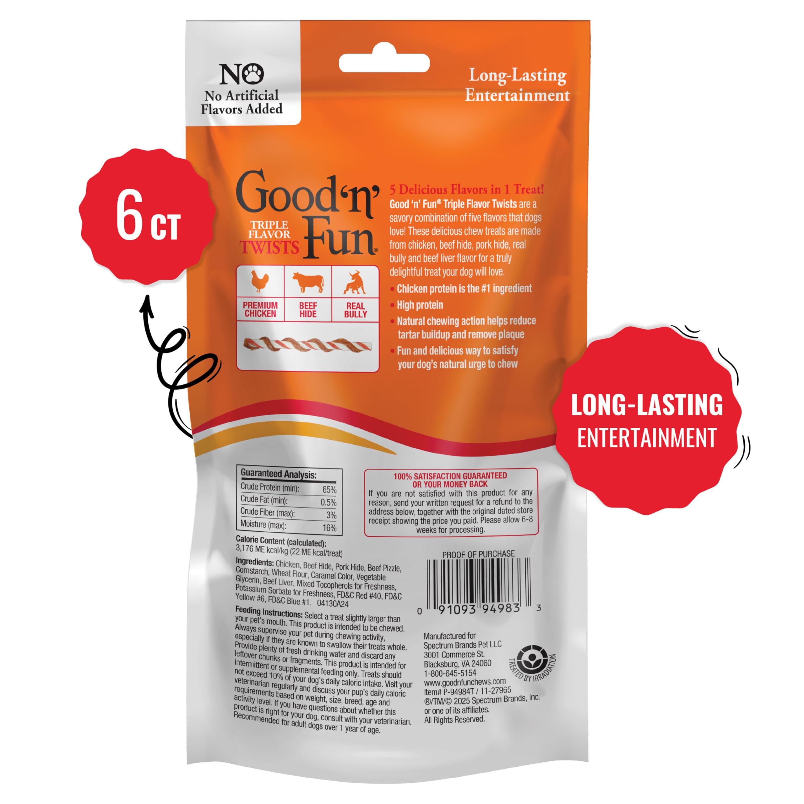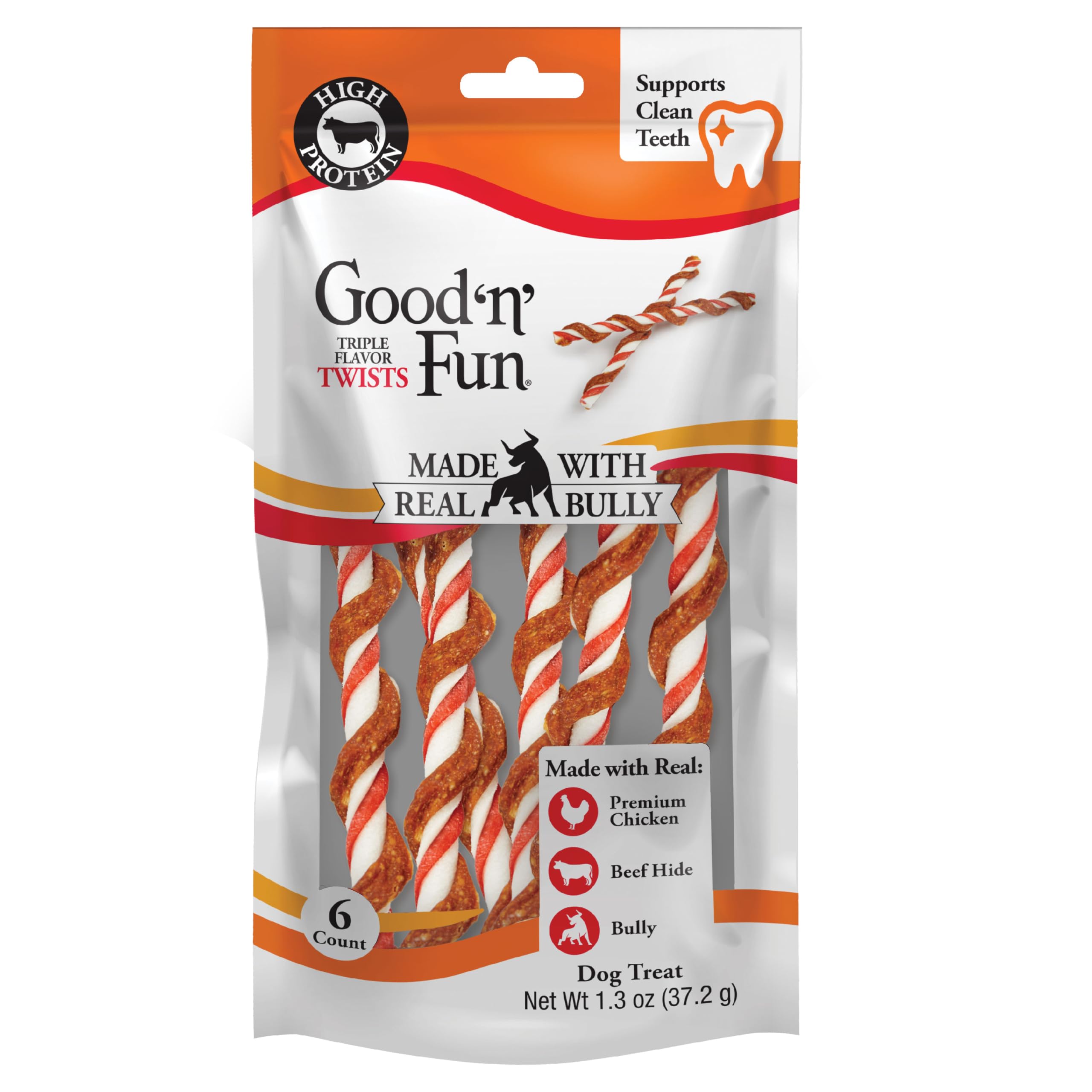 Good 'n' Fun® Triple Flavor Twists with Real Bully add protein to your dog’s diet without adding dollar signs to your budget. With more than 99% protein from animal sources, our hand-twisted, high-protein chews are made from premium chicken as the #1 ingredient, along with beef hide, pork hide, real bully and beef liver flavor for an irresistibly crave-worthy taste. And, our chews are pup-approved! With 92% palatability, dogs prefer Good 'n' Fun® Triple Flavor Twists with Real Bully over other bully products in the dog treat aisle.* Pure bully sticks can get gross and smelly, but our beef-hide chews made with real bully invite playful interaction instead of the ick factor. Engage your pup in mental stimulation during chew time to alleviate boredom and keep them occupied. Long-lasting for moderate chewers, our twists give adult dogs an entertaining way to satisfy their natural urge to chew. The chews also support clean teeth, with the natural chewing action helping reduce tartar buildup and remove plaque. With no artificial flavors added, you can have peace of mind as your dog enjoys their chew-time treat. Select a treat slightly larger than your pet’s mouth. This product is intended to be chewed. Always supervise your pet during chewing activity, especially if they are known to swallow their treats whole. Provide plenty of fresh drinking water and discard any leftover chunks or fragments. This product is intended for intermittent or supplemental feeding only. Treats should not exceed 10% of your dog’s daily caloric intake. Visit your veterinarian regularly and discuss your pup’s daily caloric requirements based on weight, size, breed, age, and activity level. If you have questions about whether this product is right for your dog, consult with your veterinarian. Recommended for adult dogs (>1 year of age).