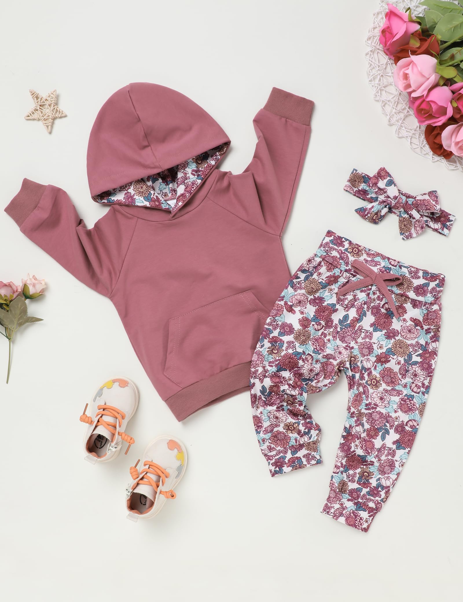 Baby Girl Outfits: Kangaroo pocket design, printed hoodie, a variety of colors and floral pants, elastic waistband pants and cute headband. Adorable toddler floral clothes will make your baby girl even cuter.