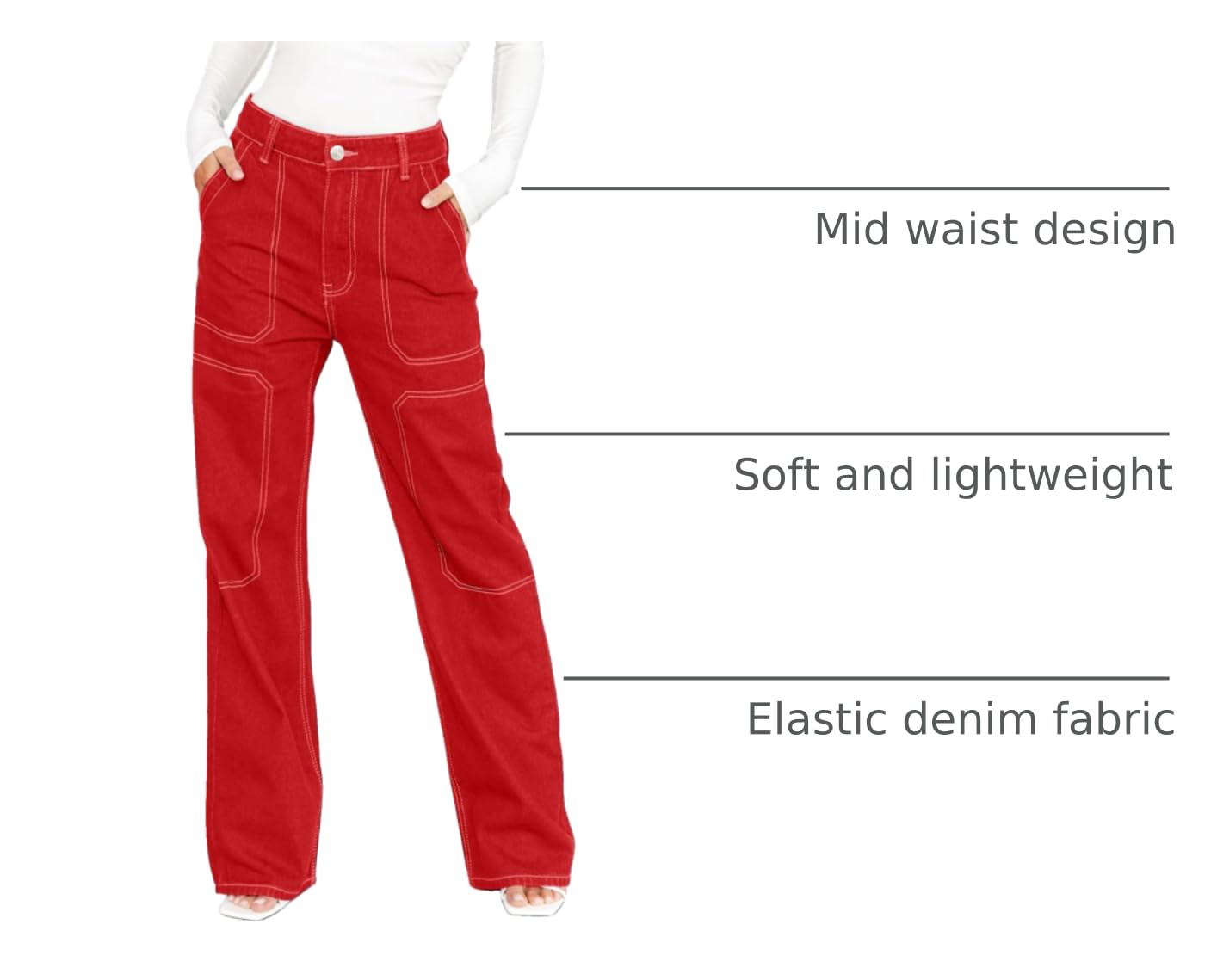 Feature: cargo jeans, mid waist, straight-leg jeans, button and zipper fly closure, straight wide leg style, four pockets, denim jeans for women.