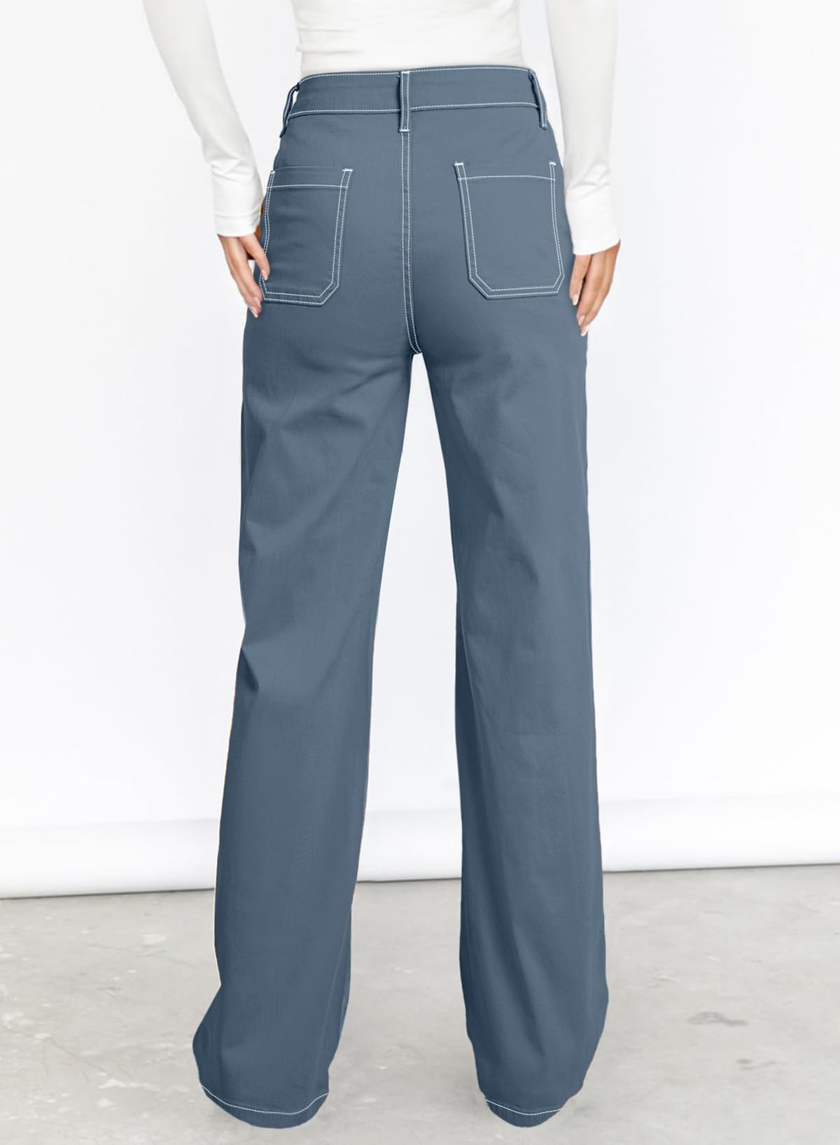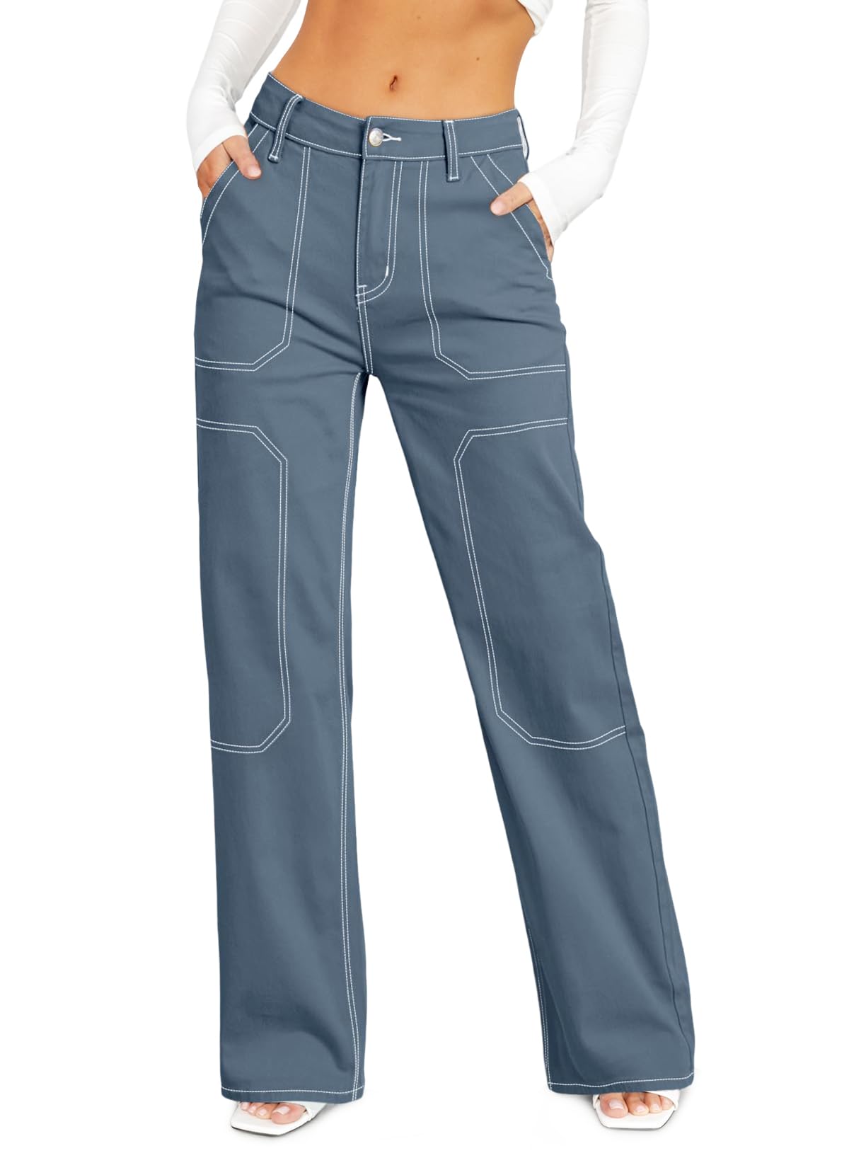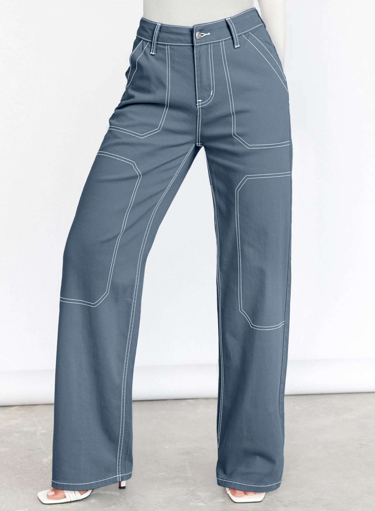 Feature: cargo jeans, mid waist, straight-leg jeans, button and zipper fly closure, straight wide leg style, four pockets, denim jeans for women.