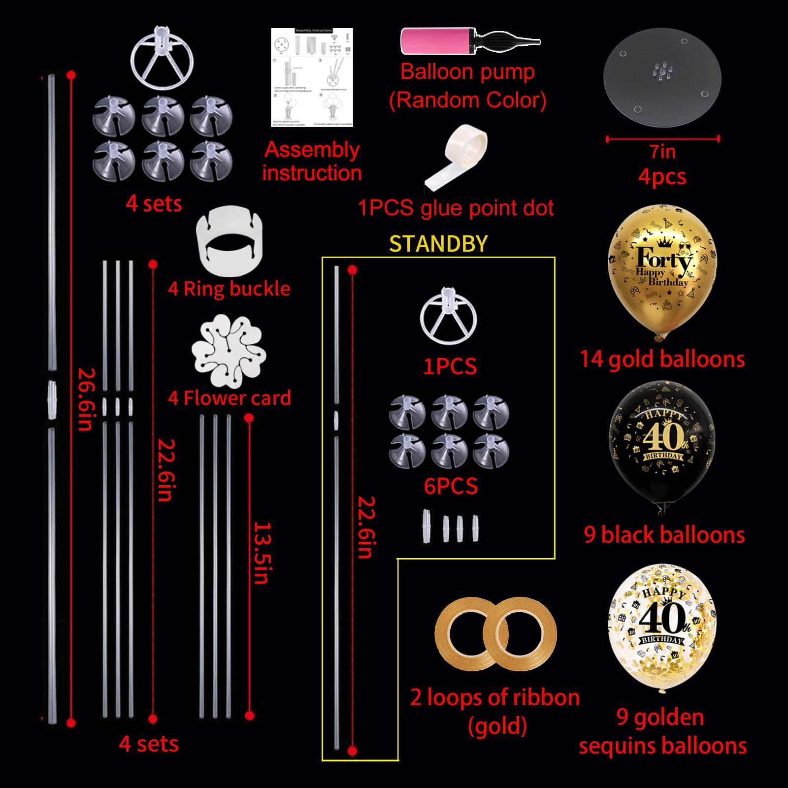 Package Includes: The balloon stand kit includes 4 reusable balloon centerpiece table decorations and 12 inch 32 pcs Latex Balloon (14 gold balloons,9 black balloons,9 gold confetti balloons),glue point dots,balloon pump,balloon clips,and tie tool.You don’t need to waste money to buy balloons