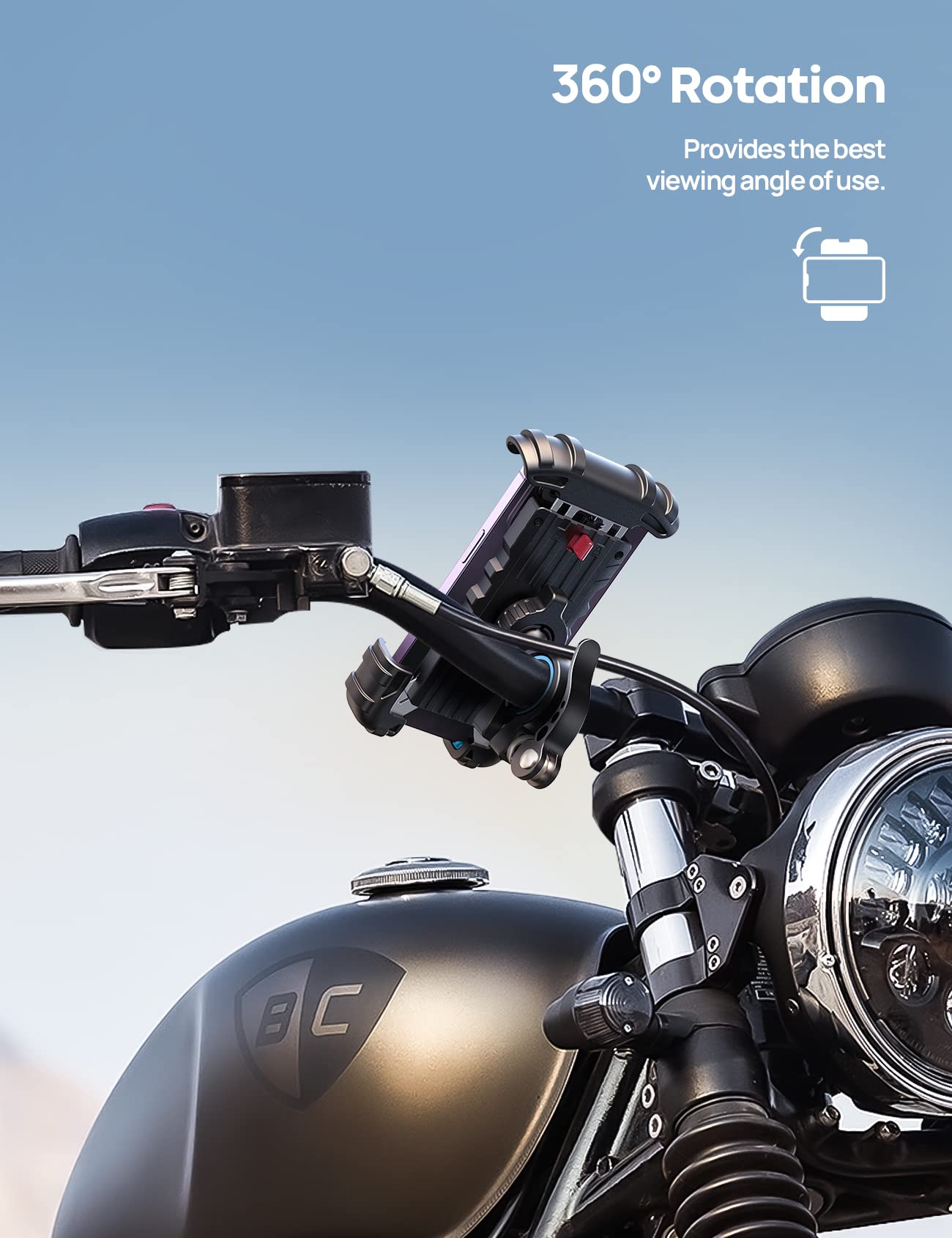 【 Sturdy and Safe】 A special shape of this motorcycle & bike phone holder grips each corner of your phone tightly. It ensures the safety of your cell phone attached to the bike handlebar even on a bumpy road. Phone clip must be locked by the red switch on the back so that phone doesn't fall off while riding!