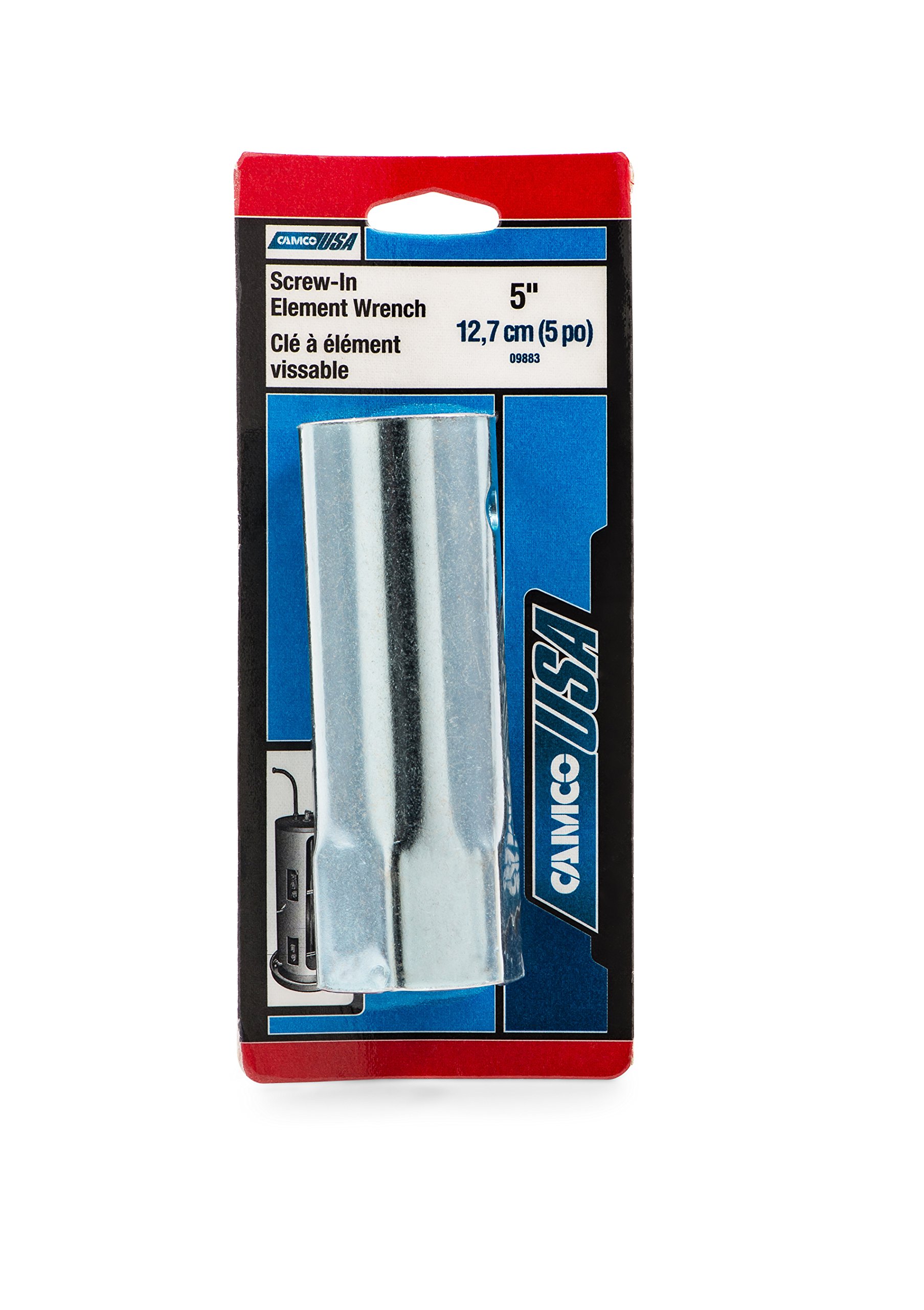 Remove and replace residential screw-in water heater elements quickly and effortlessly with Camco's 5œ Heavy Duty Water Heater Element Wrench (Model: 09883). This 5" long zinc-plated wrench goes where other wrenches can't. It works with your screwdriver and fits 1-1/2" hex screw-in type water heater elements found on residential hot water heaters.