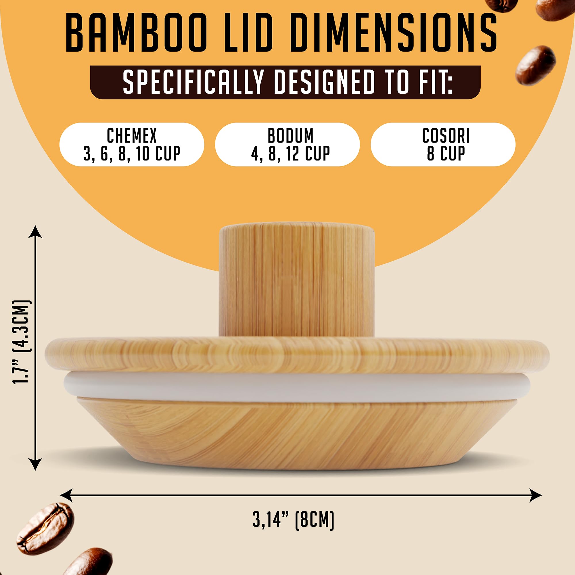 HEAT RETAINING LID - Specifically designed to fit Chemex 3, 6, 8, 10 Cup, Bodum 4, 8, 12 Cup, and Cosori 8 Cup models, this lid keeps your coffee warmer for longer periods while also preventing dust and debris from entering your coffee maker.