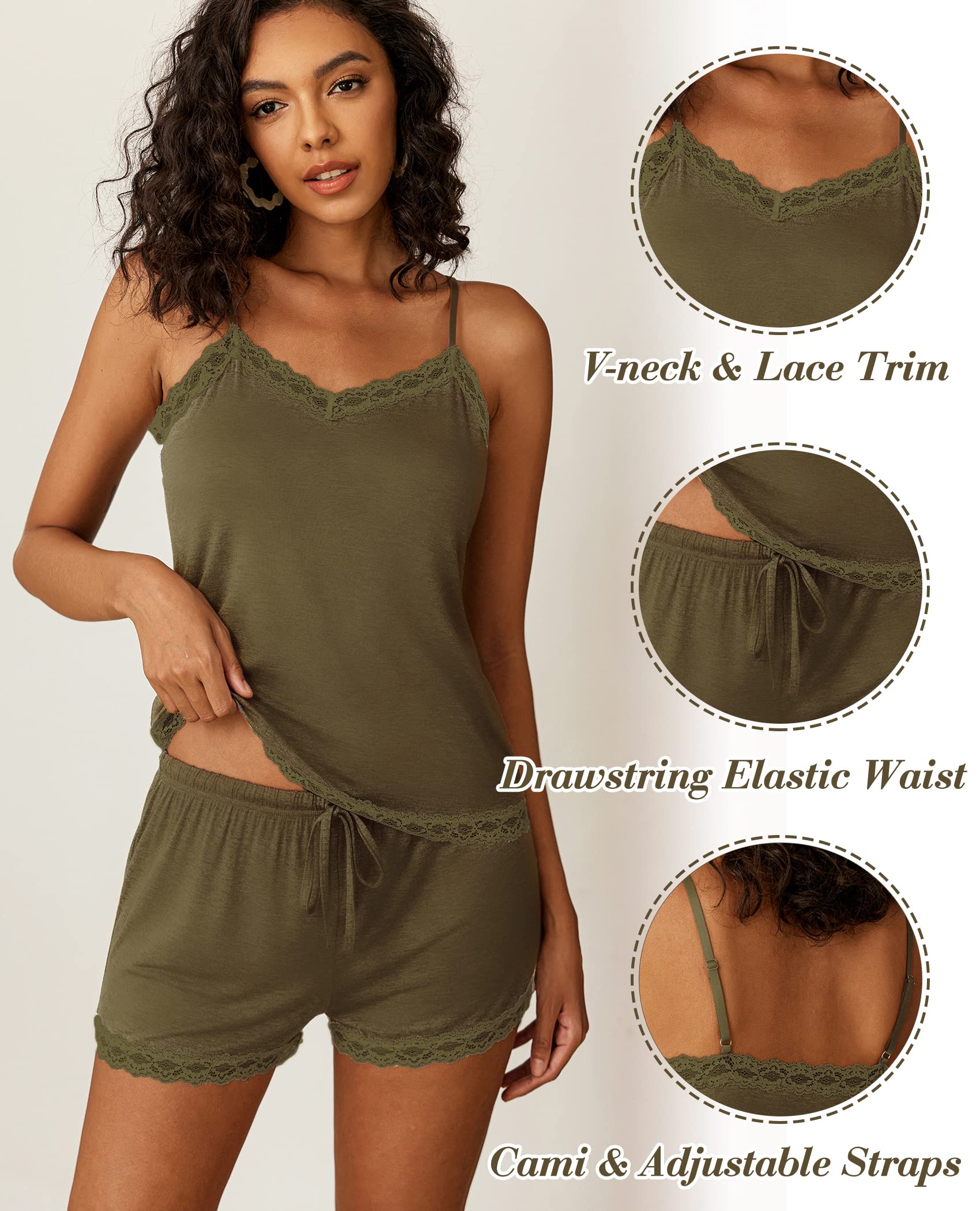 Cami pajama set women shorts featuring a plunging v neck, decent lace trim and adjustable shoulder straps, simple and stylish, shows off your body curves in nice coverage way