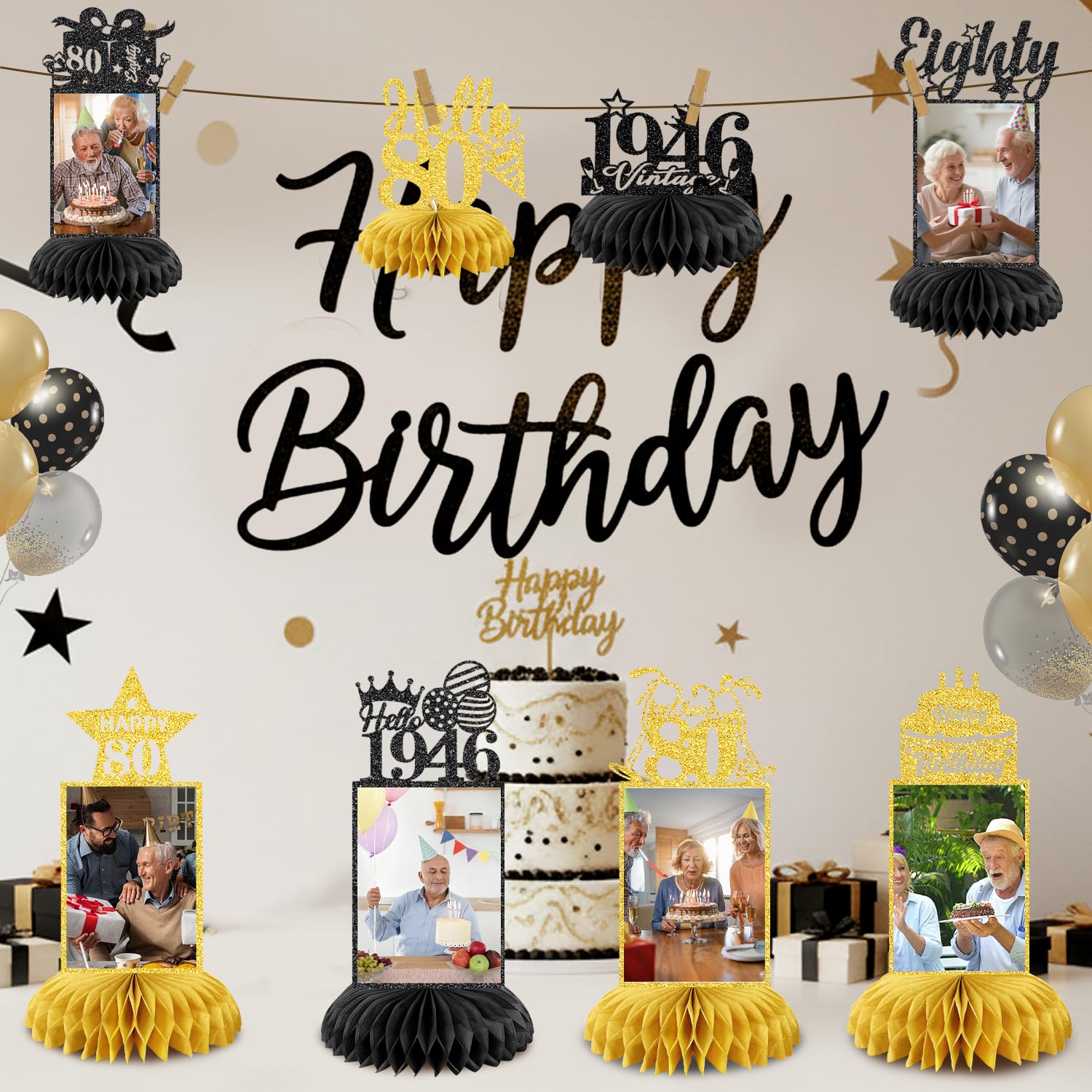✨80th BIRTHDAY THEME PARTY: The 80th birthday decorations are double-sided printing and retro black gold design. The patterns on the paper are printed with many related elements, such as 1946, cakes, balloons, 80 years, happy birthday. Create a cheerful and surprising 80 birthday atmosphere for you