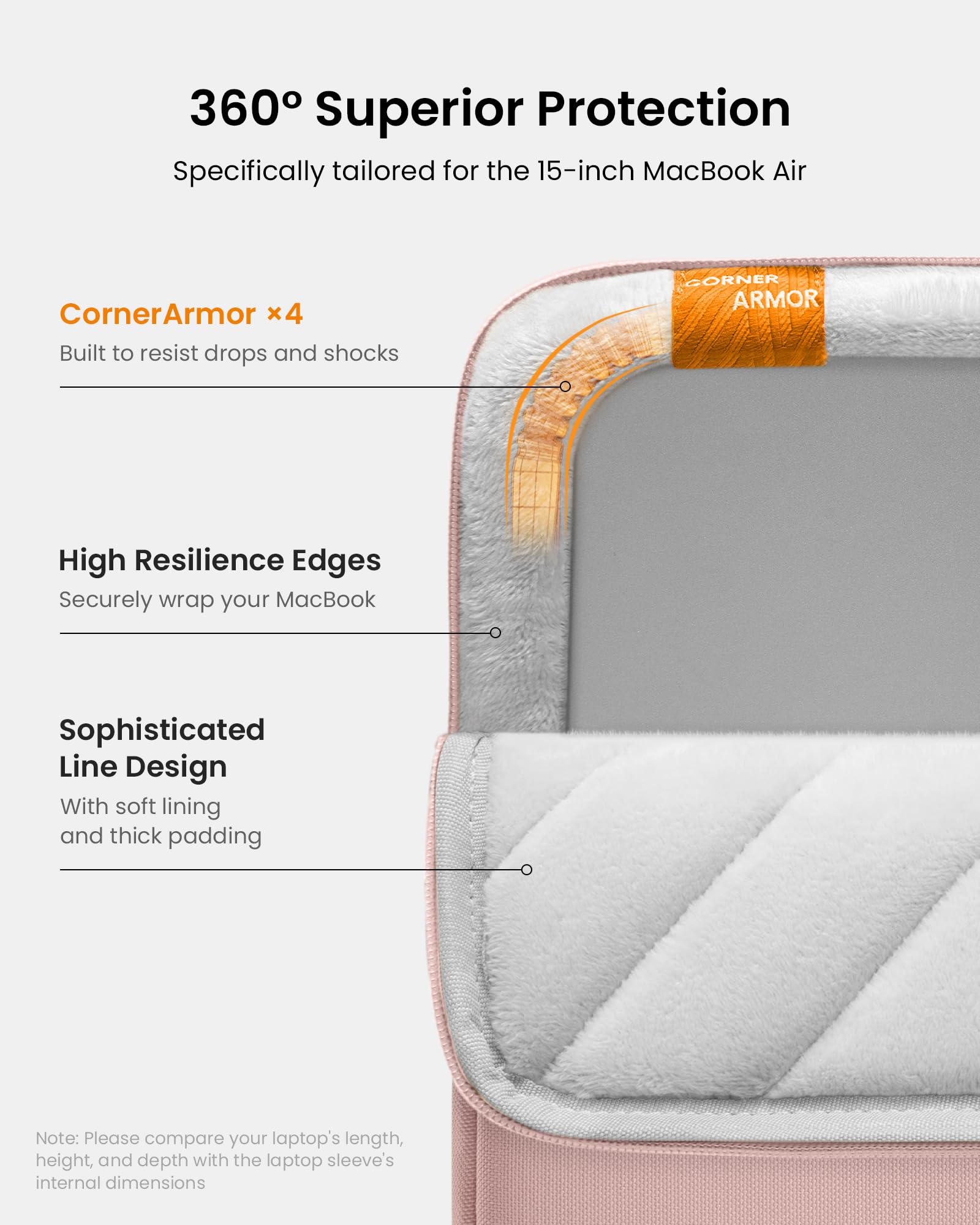 Military-Grade Protection: To combat the toughest situations: from falls to shocks to vibrations, tomtoc proposed the concept of 360 protection and designed the laptop sleeve with CornerArmor Technology, high resilience edges, and high-density soft padding. It passed the Military-Standard-Drop-Test while also maintaining a sleek design