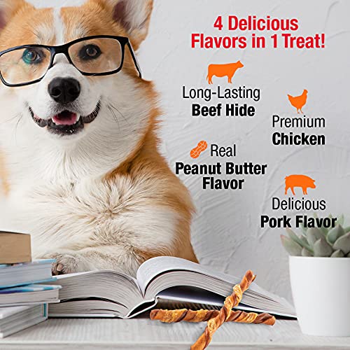 TRIPLE FLAVOR: Good ‘n’ Fun Triple Flavor Twists are made with long-lasting beef hide, wrapped in chicken and flavored with real peanut butter and delicious pork for a delicious taste your dog can’t resist.