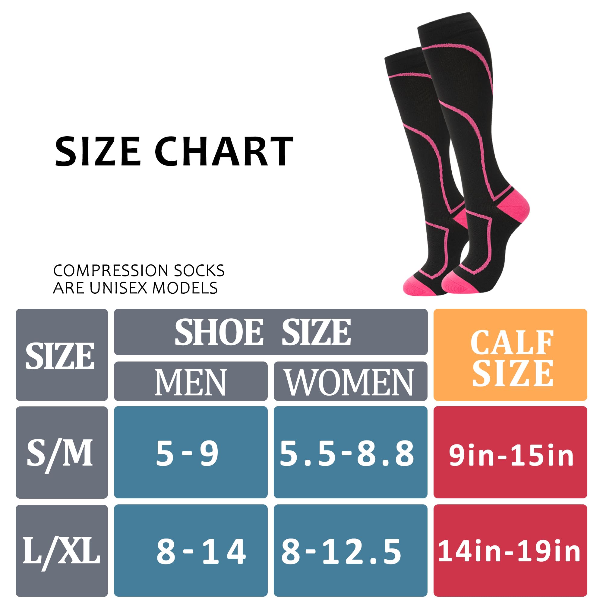 SIZE GUIDE & CARE INSTRUCTIONS: S/M fit for men shoe size 5-9, women 5.5-8.8, 9-15in calf size; L/XL fit for men shoe size 8-14, women 8-12.5, 14-19in calf size. Calf size is the primary measurement. Size up if in between sizes. It is recommended to choose our L/XL compression socks for men shoe size 9-12 with wide calves, or shoe size 13-15 with slim calves. Machine Washable. Do not iron or bleach.