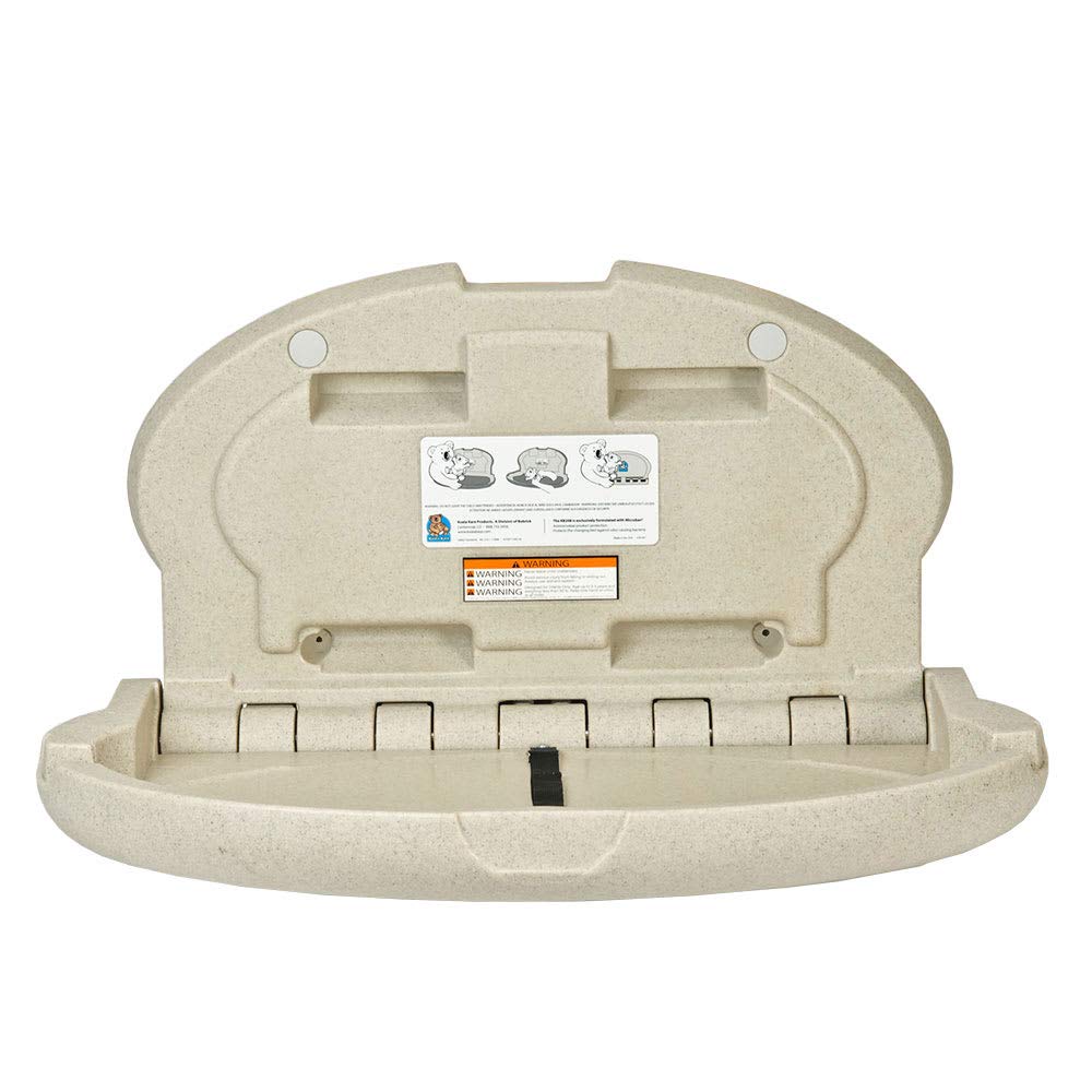 This Koala Kare Oval Changing Station comes in a sandstone color and is made from high density polypropylene. It includes a steel pivot rod for resistance to wear, and a gas spring mechanism for smooth opening and closing. This changing station also features on its bed surface to reduce . Sandstone color High density polypropylene Steel pivot rod for resistance to wear Gas spring mechanism for smooth open/close on bed surface Includes child straps Includes bag hooks ASTM and EN Compliant Meets ADA requirements when mounted properly Width: 34" Height: 21" Depth (closed): 4" Extension (open): 21" Model #: KB208-14