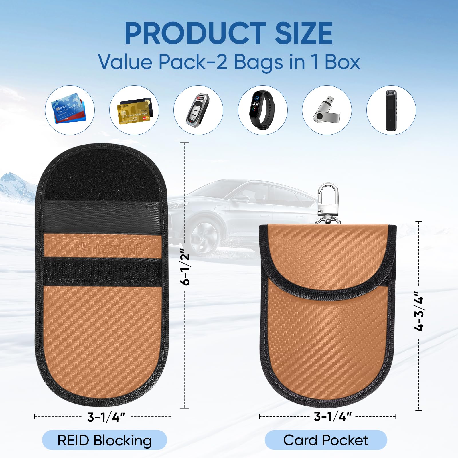 Premium Quality: TICONN faraday bag is constructed with premium carbon fiber textured material and two-layers of shielding materials packed in a gift box; It provides signal blocking functions as well as a luxurious fashionable appurtenance