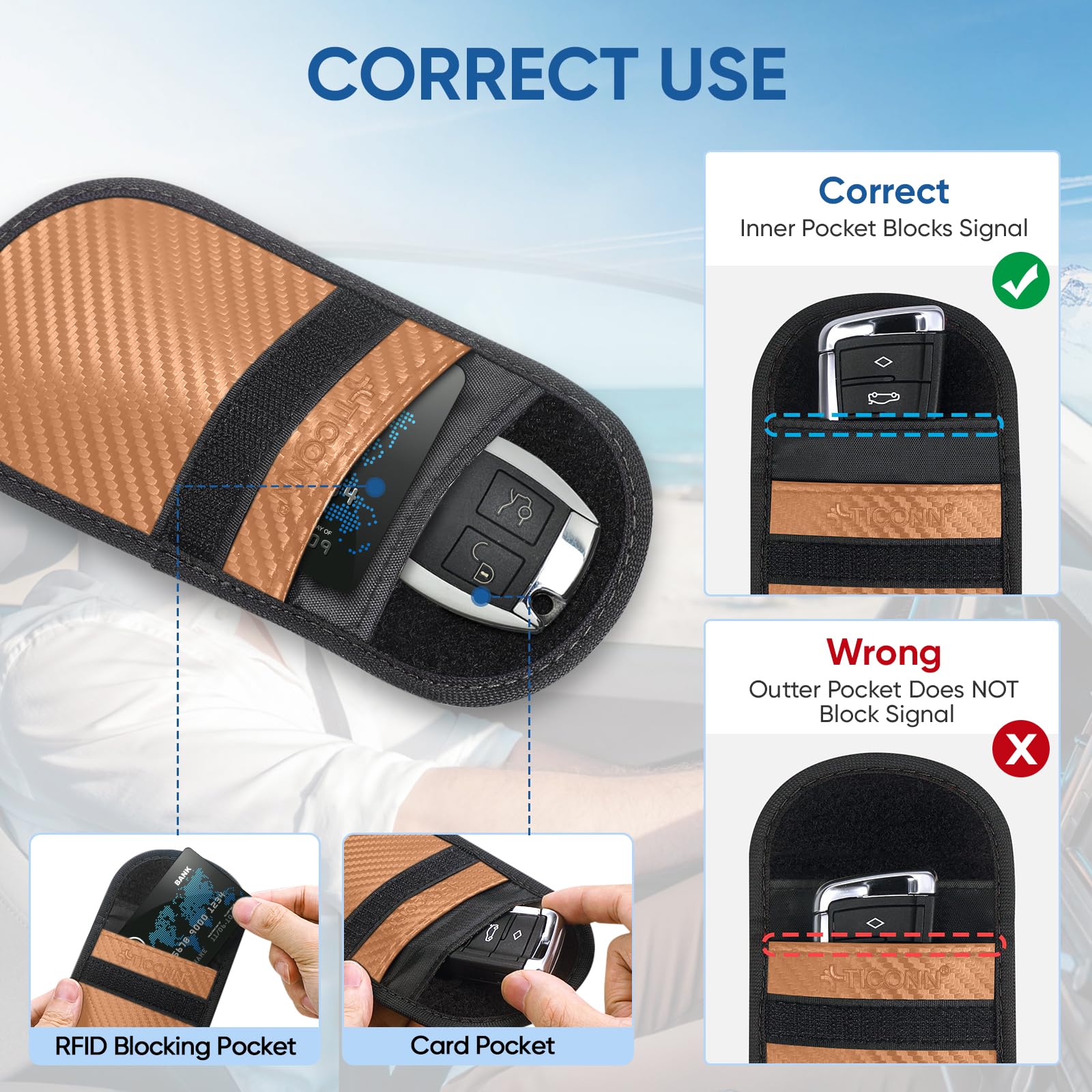 Convenience: The smaller/front pocket is anti-radiation, best for storing ID card, bank cards, etc; The larger/back pocket is for signal blocking, best for storing car key fobs