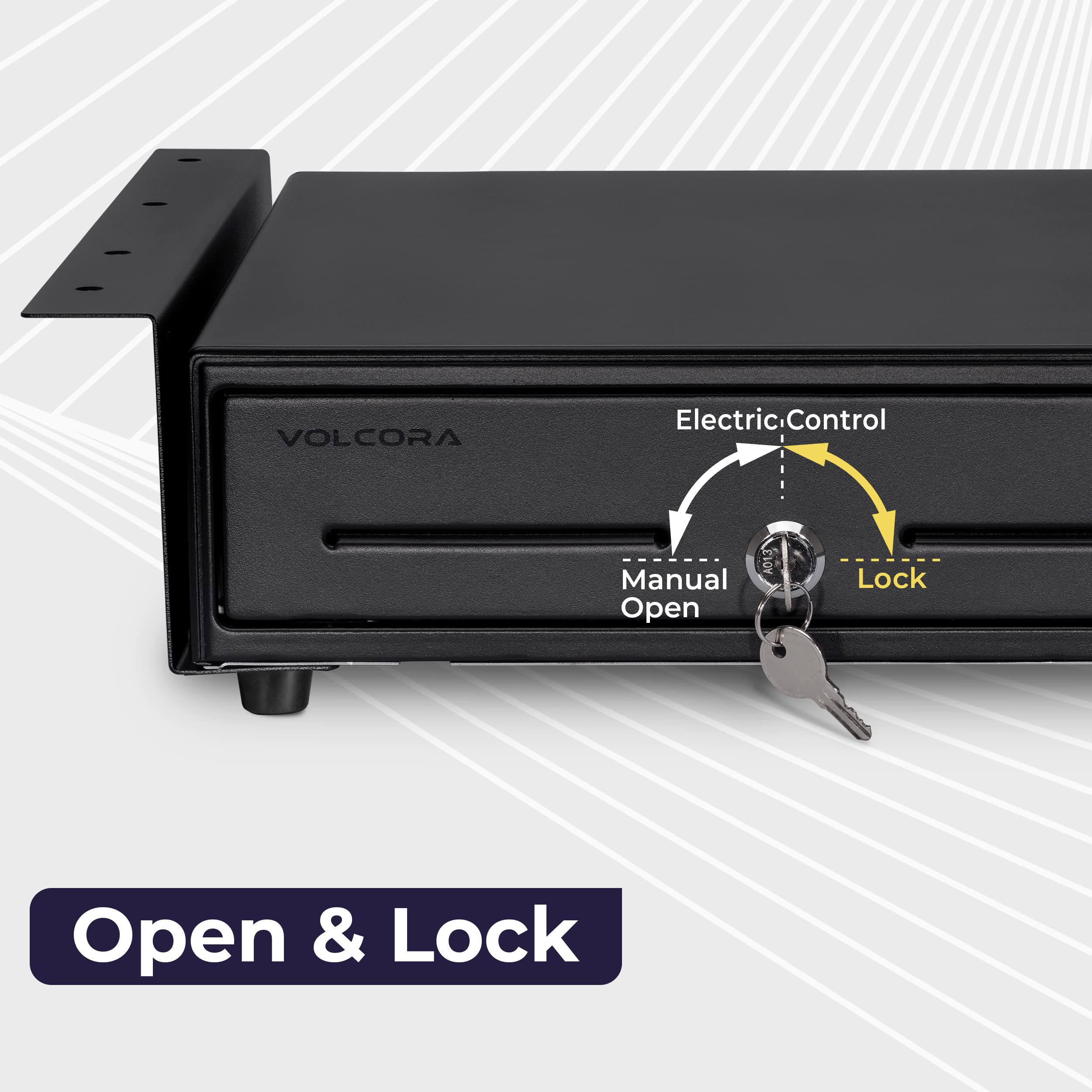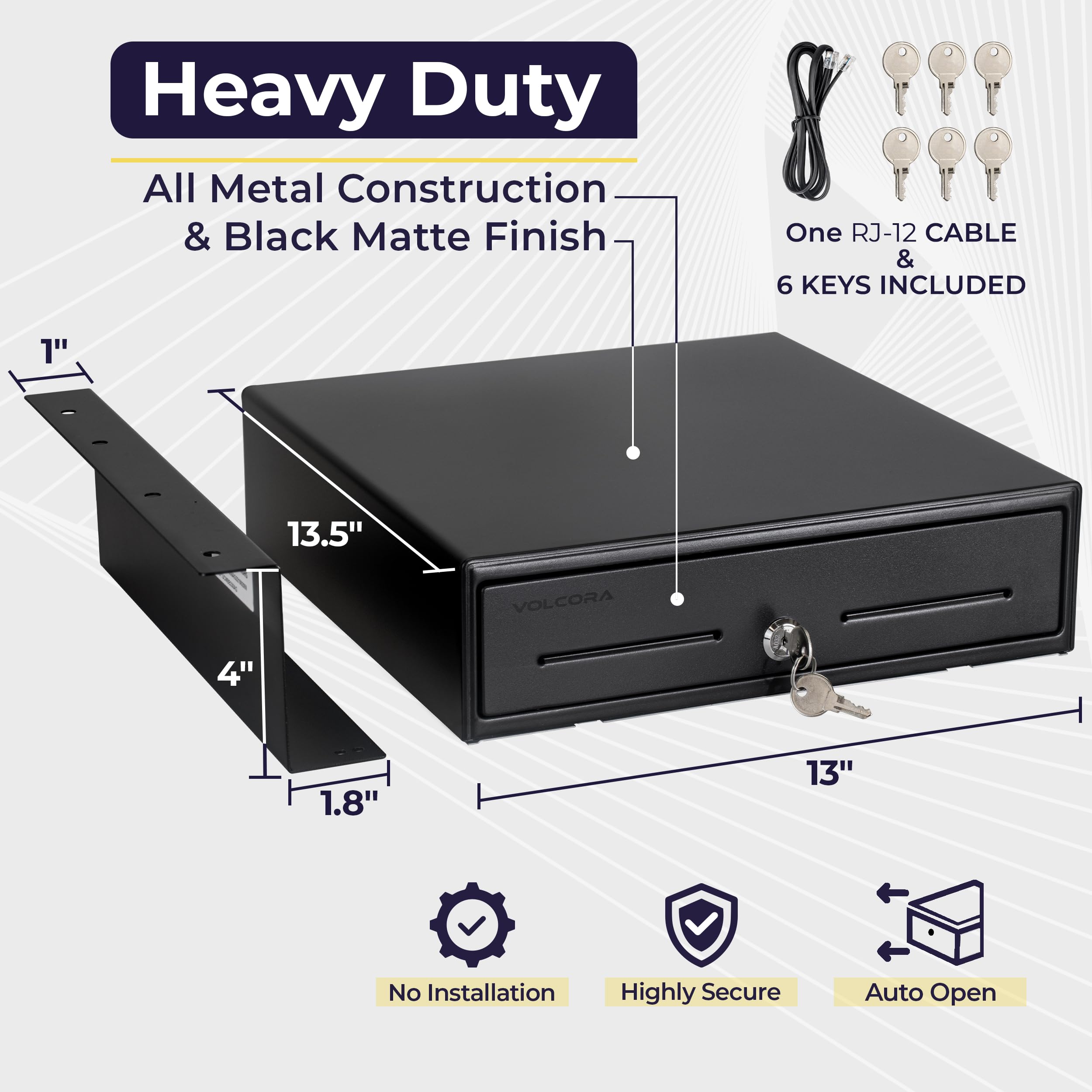 DURABLE POS CASH DRAWER: Volcora cash register drawer measures 13”x13.25”x4”, voltage is at 24 VDC. Our money drawer has a heavy-duty durable metal frame that is an ideal cash register for small businesses and even big establishments too.