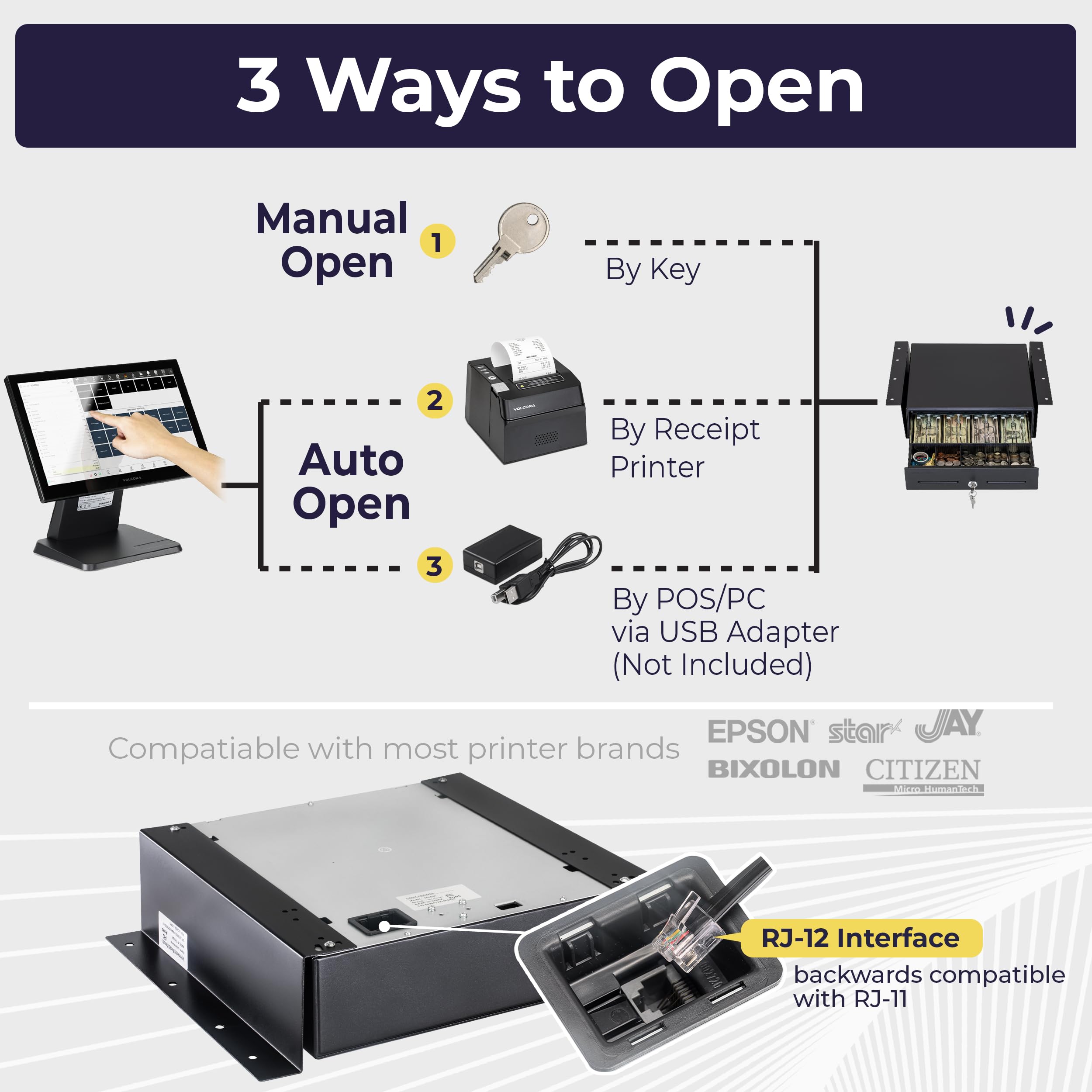 CONNECTIVITY AND COMPATIBILITY: Our cash drawer suits the point of sale system for small business. Just connect the cash drawer to a receipt printer via the RJ11 / RJ12 cable included in the package, and then to your POS to automatically open or close cash trays. Our product is compatible with most major receipt or thermal printer brands such as Star, Citizen, JAY, and Bixolon. (No USB port, so CANNOT be connected to POS directly via USB)