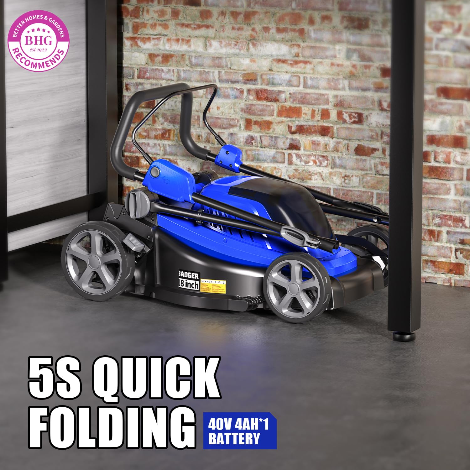 LIGHT TO PUSH, QUICK TO STORE– At about 37.5 lb with a compact 18" deck, this mower is easy to maneuver around trees, beds, and tight corners. When you’re done, the handle folds in about 5 seconds so you can slide it against a wall or into a small shed—exactly what many reviewers love about this mower.